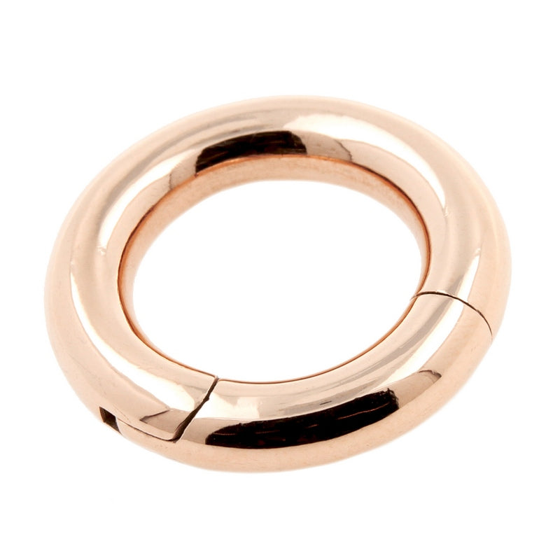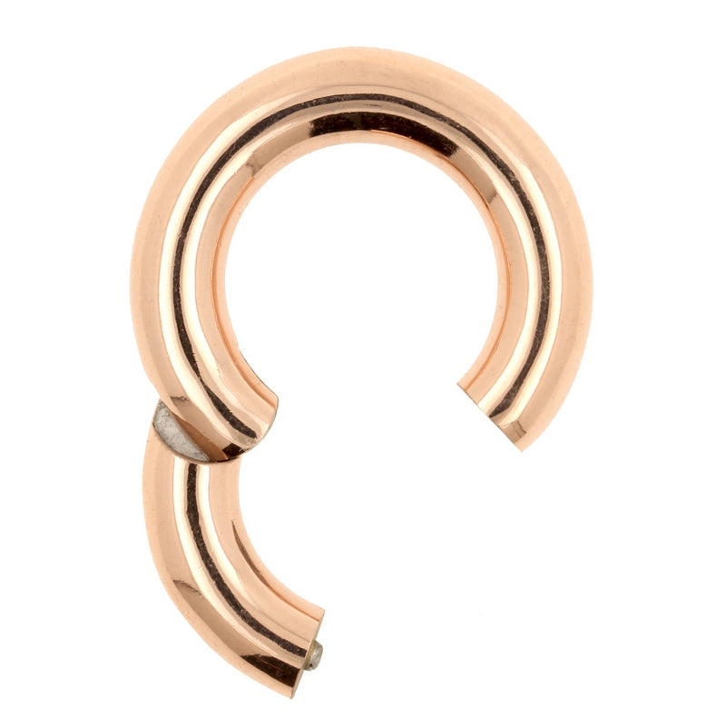 Pretty basics! The perfect piercing ring if you like the look of a smooth segment ring, but need something that's easy to use as well. The segment of this click ring is hinged and can easily be opened and closed. The closing mechanism is very easy to use and allows a smooth insertion into your piercings. Made of rose gold P.V.D. coated surgical steel and available in different colors and sizes!