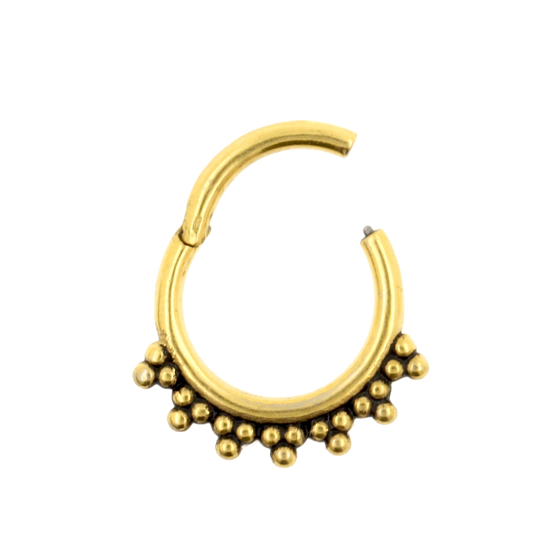 High quality piercing ring with easy to use clicking mechanism! This beautiful ring is features beautiful, vintage style decoration and has a curved stem. The rings suitable for all kinds of piercings, giving them an extra fancy look in an instant. Made of high quality surgical steel with a mirror finish and available in different colors and designs.