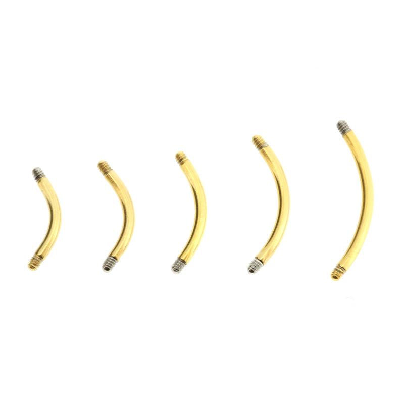 Piercing spare parts with a touch of real gold! Basic 1,2 mm curved barbell post made of surgical 316L steel, with a P.V.D coating made of real 24K gold! The new coating techniques that are used to create this piece of jewelry ensure top notch quality and a wear-resistant, high sheen finish. Perfect posts for when you simply need to replace a post on your piercing jewelry, or want to keep a spare at hand. These posts are a perfect match with our 24k gold P.V.D. coated piercing jewelry range. Please note that you will receive the seperate post only upon ordering, without threaded balls or other accessories.