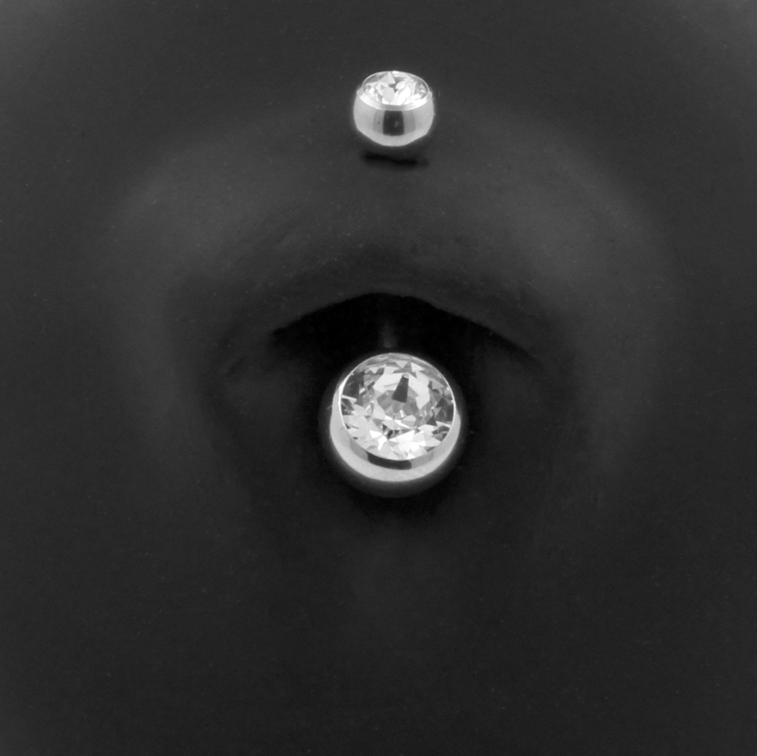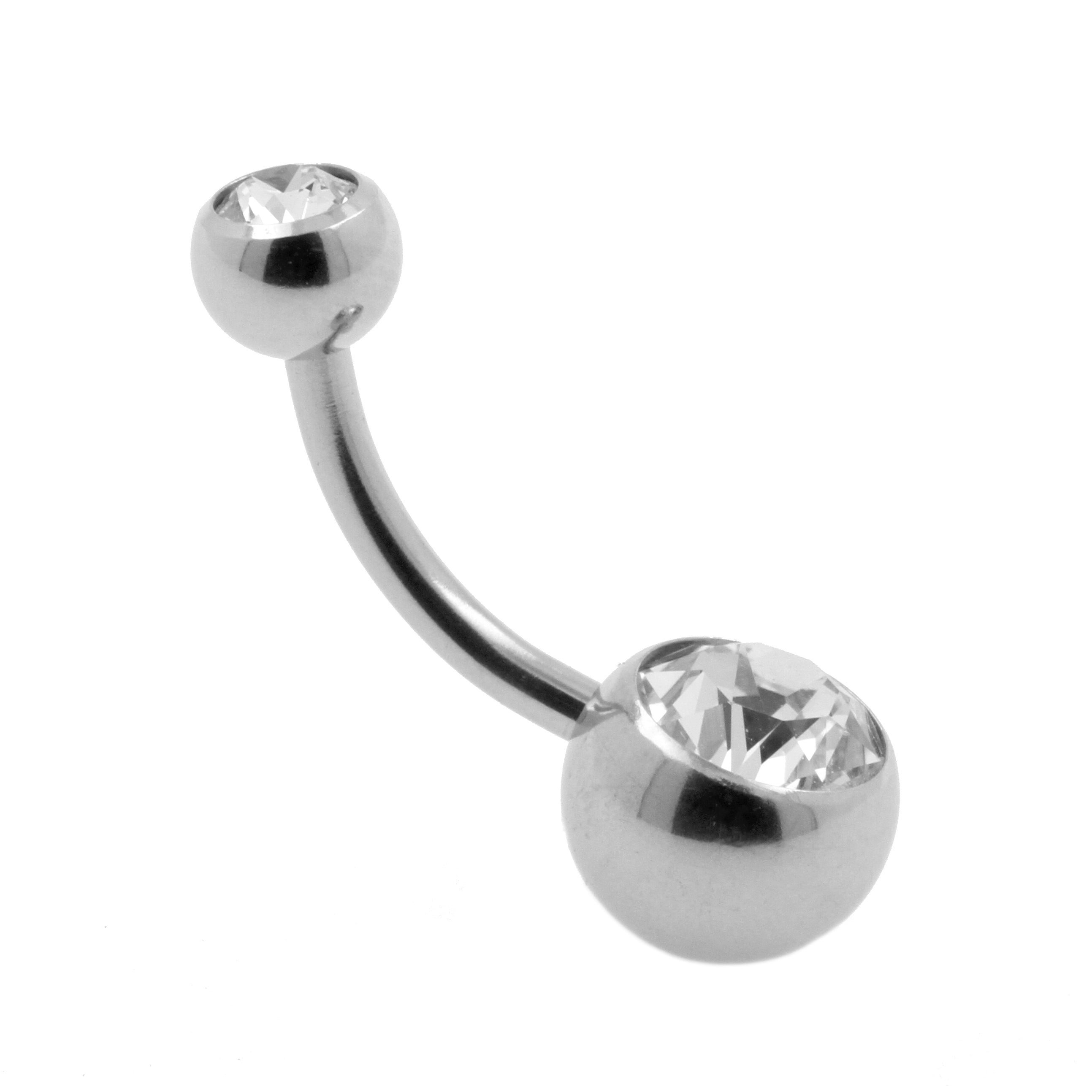 The essential basics! Belly ring of 316L surgical steel with two threaded, jewelled balls. The belly ring is set with shiny crystals that will ad a sparkly touch to your belly ring. Suitable for 1,6 mm navel piercings. The top ball measures 5 mm in diameter, the bottom ball measures 8 mm in diameter. Available in different colors!