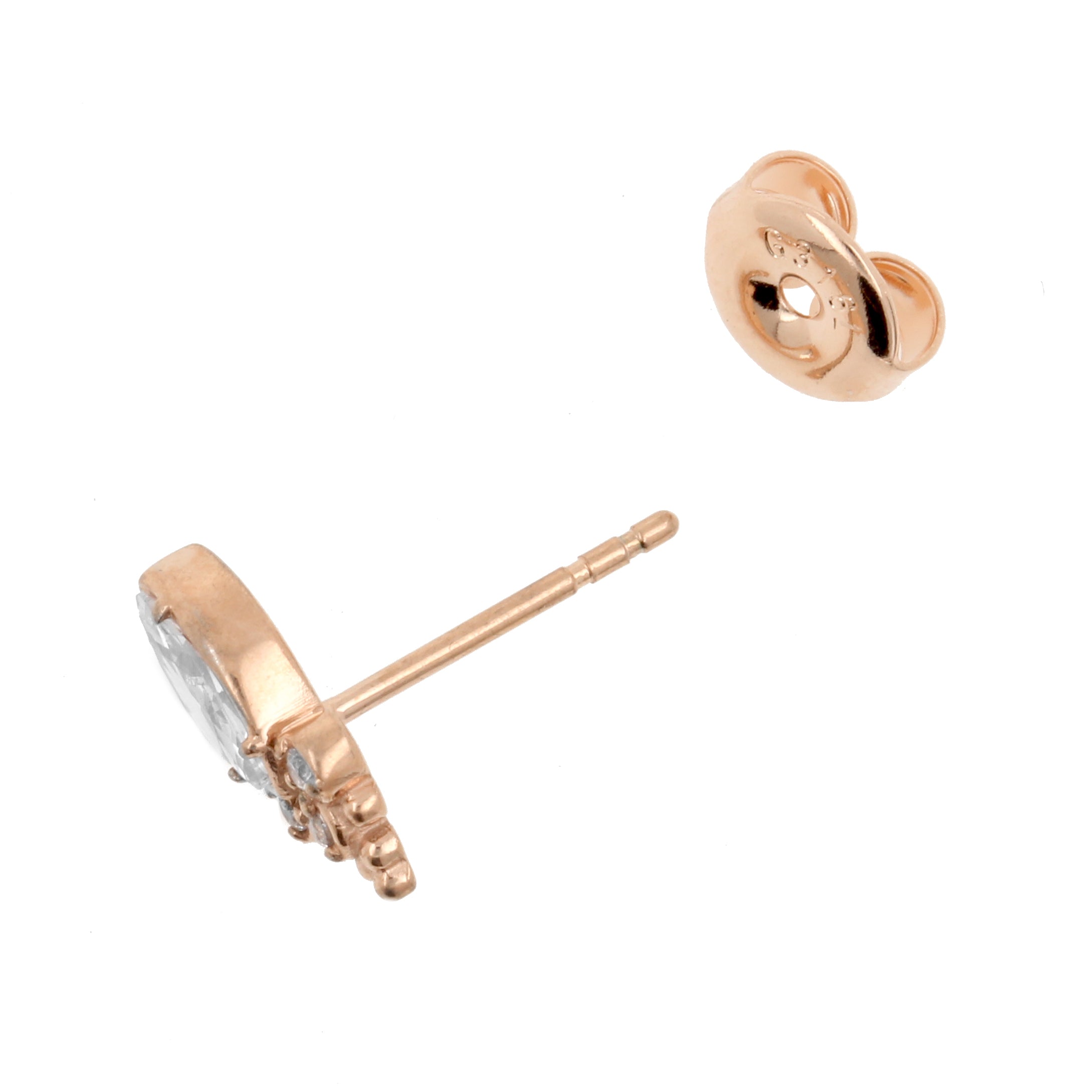 Beautiful ear studs made of rose gold coated surgical steel, the perfect match for regular sized earrings! These studs are richly ornated with a bigger marquise zirconia, three small round zirconias and small dots. The ear studs are suitable for 0,8 mm earrings and are fitted with a basic, butterfly back for a secure fit. Available in three colors.