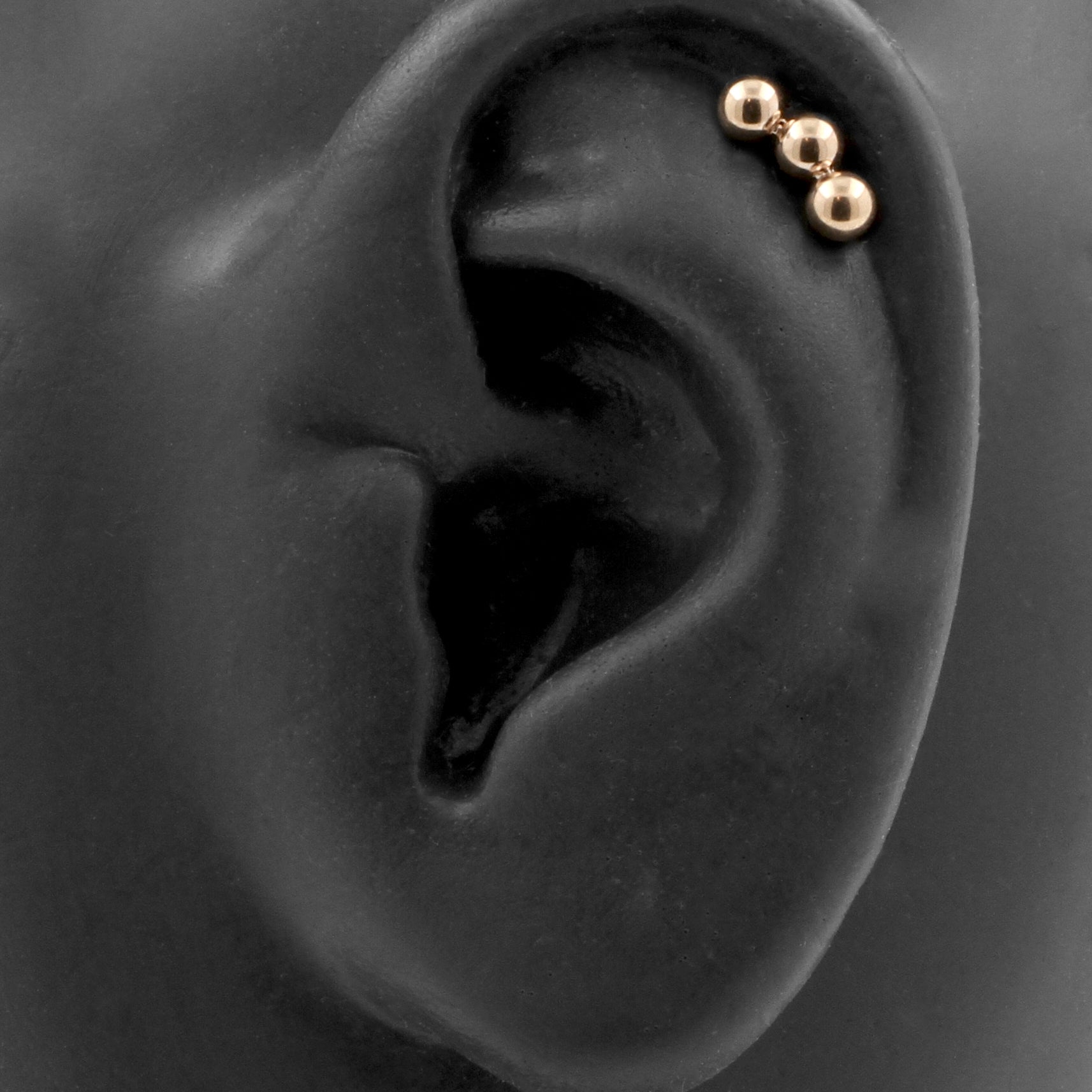 The perfect jewelry for helix and tragus piercings! This beautiful Helix Barbell is fitted with normal threading and perfect for all kinds of piercings. Features a lovely, triple dots accessory to make your piercings look even more awesome. Each ball is fitted with seperate threading, which allows you to find the perfect fit for your ears. Made of surgical steel and polished to a super high sheen! Please note that due to the unique shape of the attachment, changing jewelry might be a bit more challenging. Try twisting the post instead of the accessory, this usually makes changing your jewelry a bit easier.