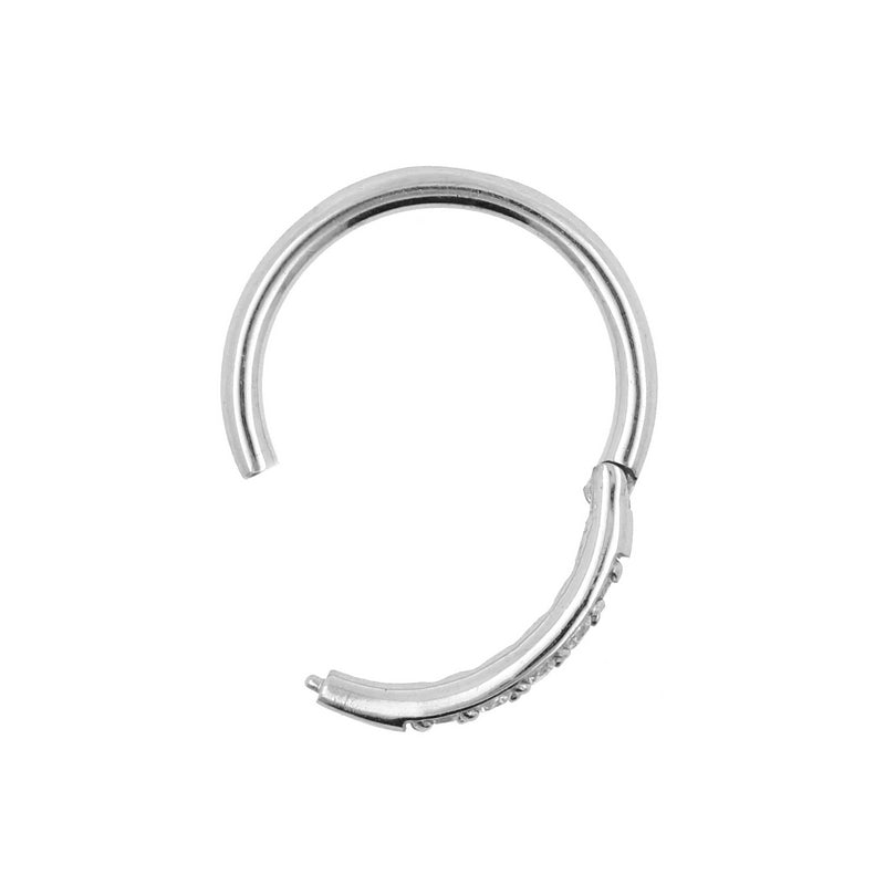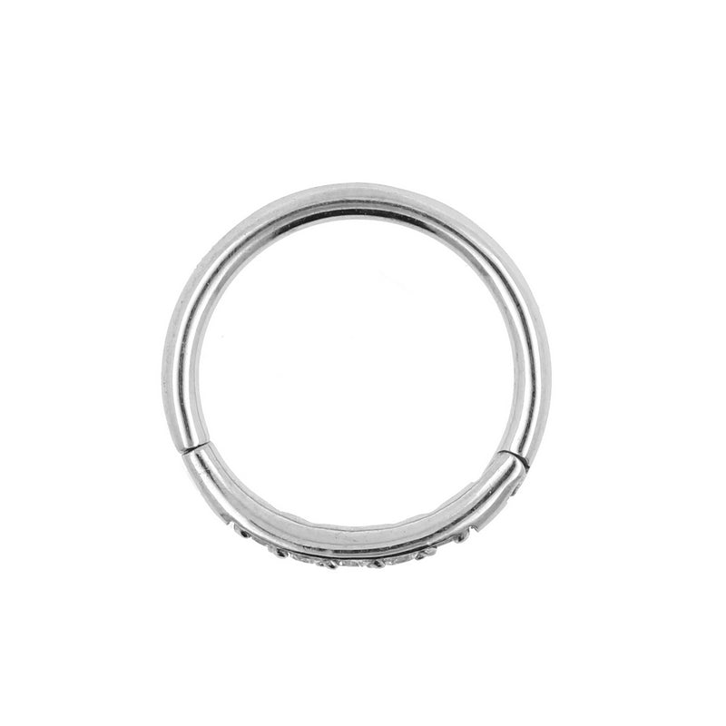 Easy to use click ring for your cartilage piercings! This click ring is made of surgical steel and set with a row of shiny zirconias in smooth pave setting on the outside of the ring. Our click rings are perfect for all kinds of piercings and very easy to use. The segment of this click ring is hinged and can easily be opened and closed. Simply open the ring, insert it into your piercing and click it shut. Done!