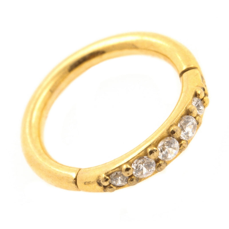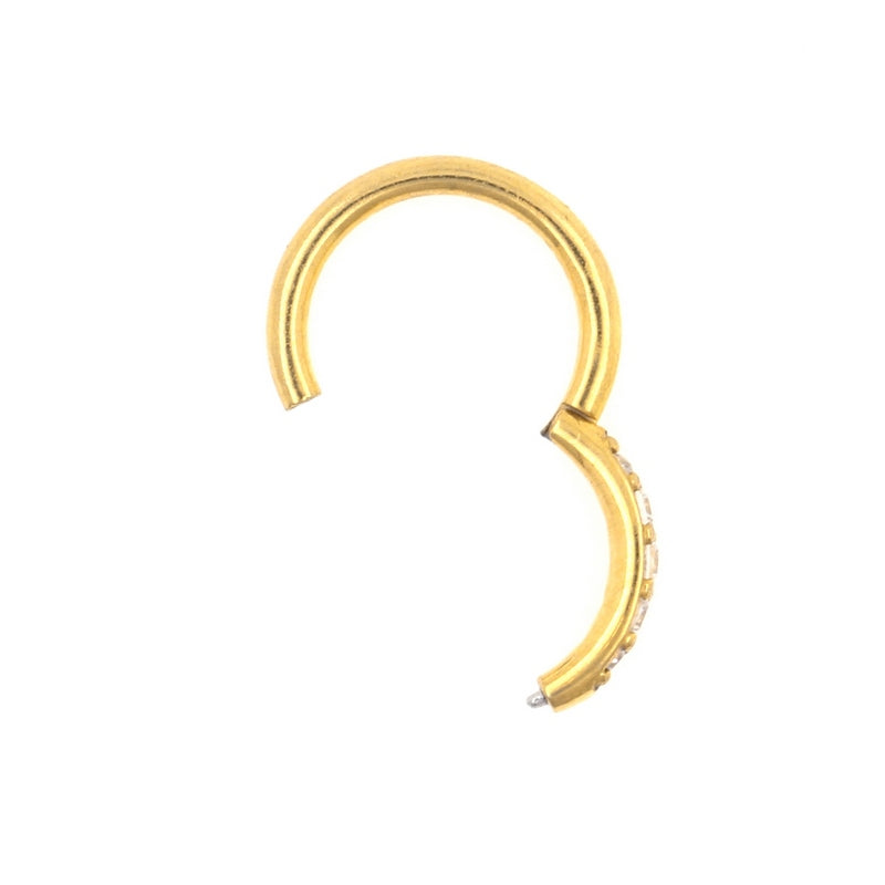 Easy to use click ring for your cartilage piercings! This click ring is made of surgical steel and set with a row of shiny zirconias in smooth pave setting on the outside of the ring. Our click rings are perfect for all kinds of piercings and very easy to use. The segment of this click ring is hinged and can easily be opened and closed. Simply open the ring, insert it into your piercing and click it shut. Done!
