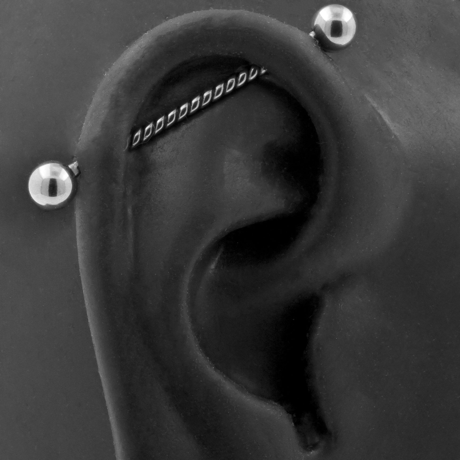 Beautiful industrial barbell, perfect for industrial piercings! This extra long piercing barbell is made of surgical steel and is decorated with a pretty, twisted rope design, making your industrial piercing look super fancy. The barbell measures 1,6 mm in thickness and is available in different lengths. Both balls measure 5 mm in diameter and are detachable, making this barbell easy to insert into your industrial piercing. Available in different lengths!