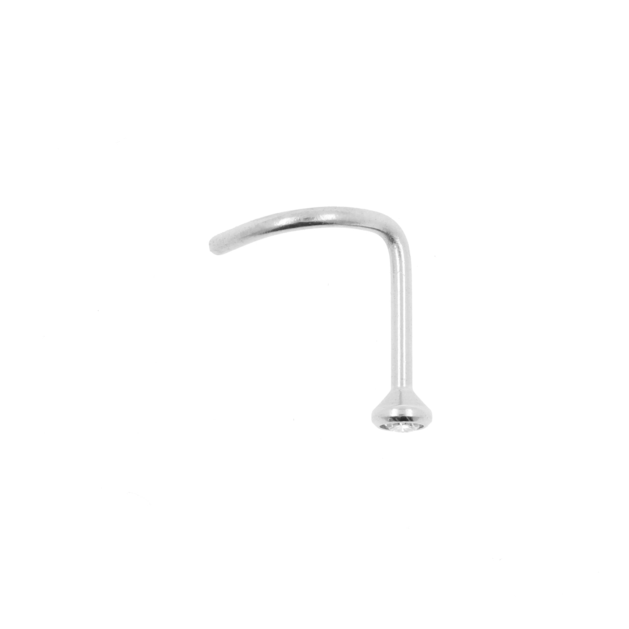 Spice up that nose! This nosestud is made of 316L surgical steel and measures 0,8 mm in thickness. The top end is set with a small crystal, the stem is curved to keep the jewelry in place once worn in your piercing.