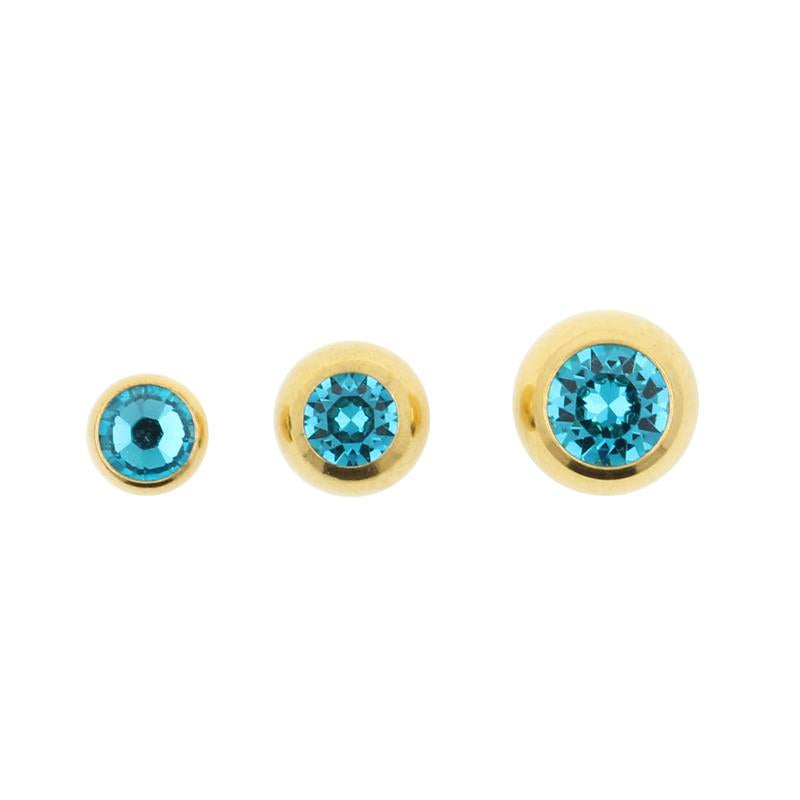 The essential basics, with a touch of real gold! These threaded, jewelled balls are are set with a small crystal and made of surgical 316L steel, with a P.V.D coating made of real 24K gold!  The new coating techniques that are used to create this piece of jewelry ensure top notch quality and a wear-resistant, high sheen finish. Great to keep at hand whenever you need a replacement, or simply want to switch to another size. Our threaded balls are a perfect match with our 24k gold P.V.D. coated piercing jewelry range.