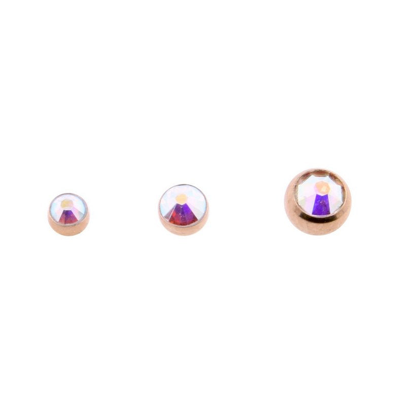 The essential basics, with a touch of rose gold! These threaded, jewelled balls are are set with a small crystal and made of surgical 316L steel, with a rose gold P.V.D coating.  The new coating techniques that are used to create this piece of jewelry ensure top notch quality and a wear-resistant, high sheen finish. Great to keep at hand whenever you need a replacement, or simply want to switch to another size. Our threaded balls are a perfect match with our rose gold P.V.D. coated piercing jewelry range.