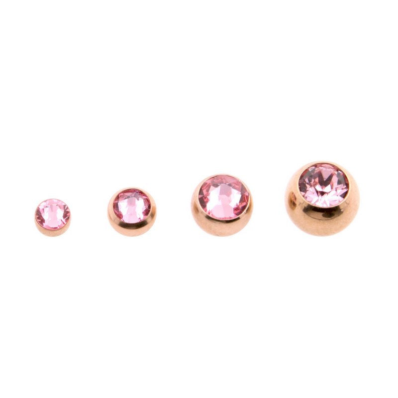 The essential basics, with a touch of rose gold! These threaded, jewelled balls are are set with a small crystal and made of surgical 316L steel, with a rose gold P.V.D coating.  The new coating techniques that are used to create this piece of jewelry ensure top notch quality and a wear-resistant, high sheen finish. Great to keep at hand whenever you need a replacement, or simply want to switch to another size. Our threaded balls are a perfect match with our rose gold P.V.D. coated piercing jewelry range.