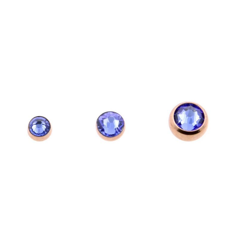 The essential basics, with a touch of rose gold! These threaded, jewelled balls are are set with a small crystal and made of surgical 316L steel, with a rose gold P.V.D coating.  The new coating techniques that are used to create this piece of jewelry ensure top notch quality and a wear-resistant, high sheen finish. Great to keep at hand whenever you need a replacement, or simply want to switch to another size. Our threaded balls are a perfect match with our rose gold P.V.D. coated piercing jewelry range.