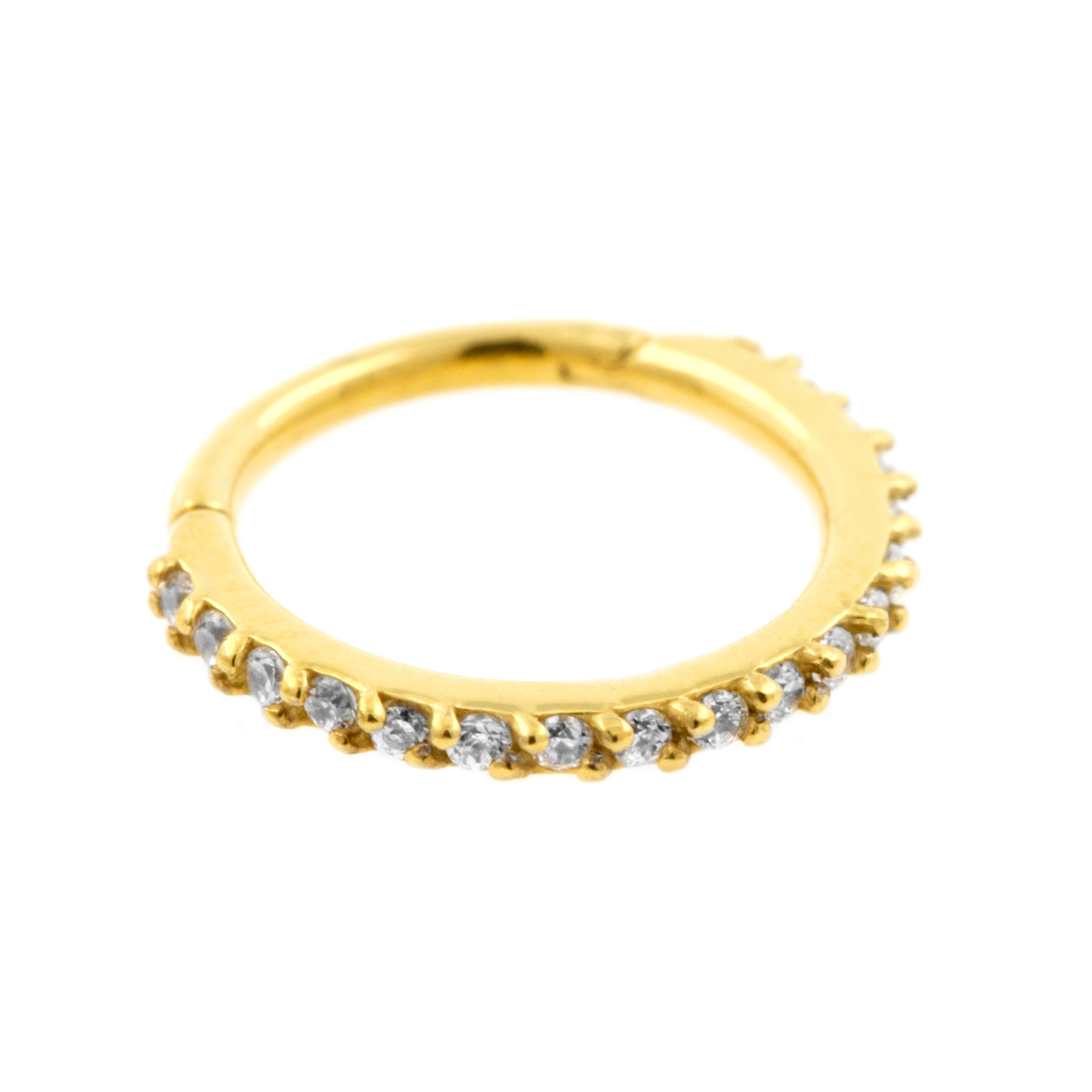 Easy to use click ring for your nostril piercings! This click ring is made of surgical steel and set with a row of shiny zirconias in smooth pave setting on the outside of the ring. Our click rings are perfect for all kinds of piercings and very easy to use. The segment of this click ring is hinged and can easily be opened and closed. Simply open the ring, insert it into your piercing and click it shut. Done!