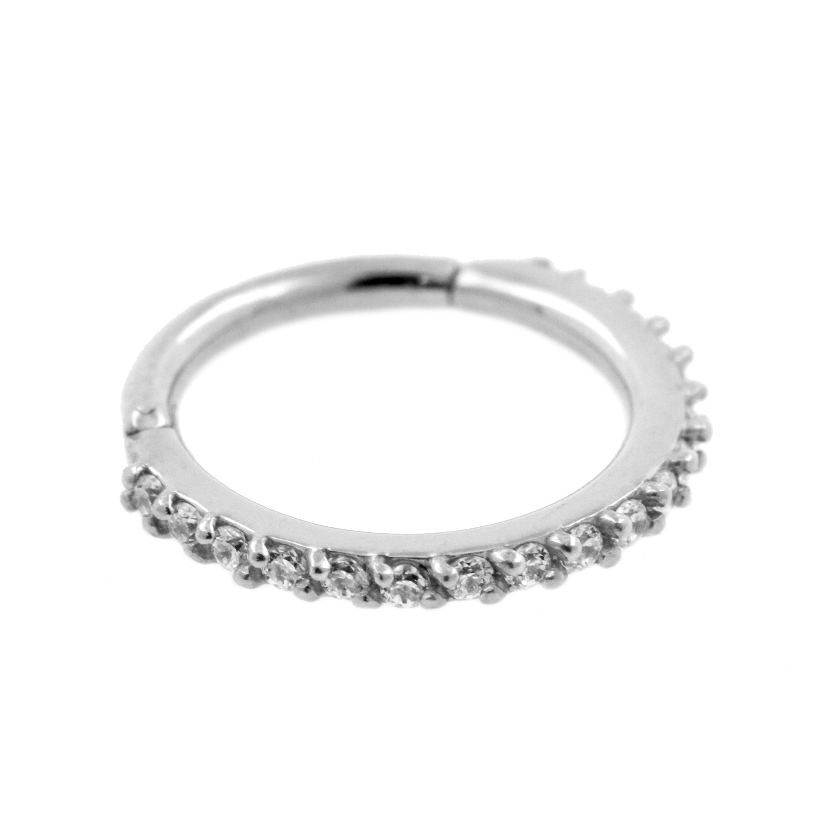 Easy to use click ring for your nostril piercings! This click ring is made of surgical steel and set with a row of shiny zirconias in smooth pave setting on the outside of the ring. Our click rings are perfect for all kinds of piercings and very easy to use. The segment of this click ring is hinged and can easily be opened and closed. Simply open the ring, insert it into your piercing and click it shut. Done!