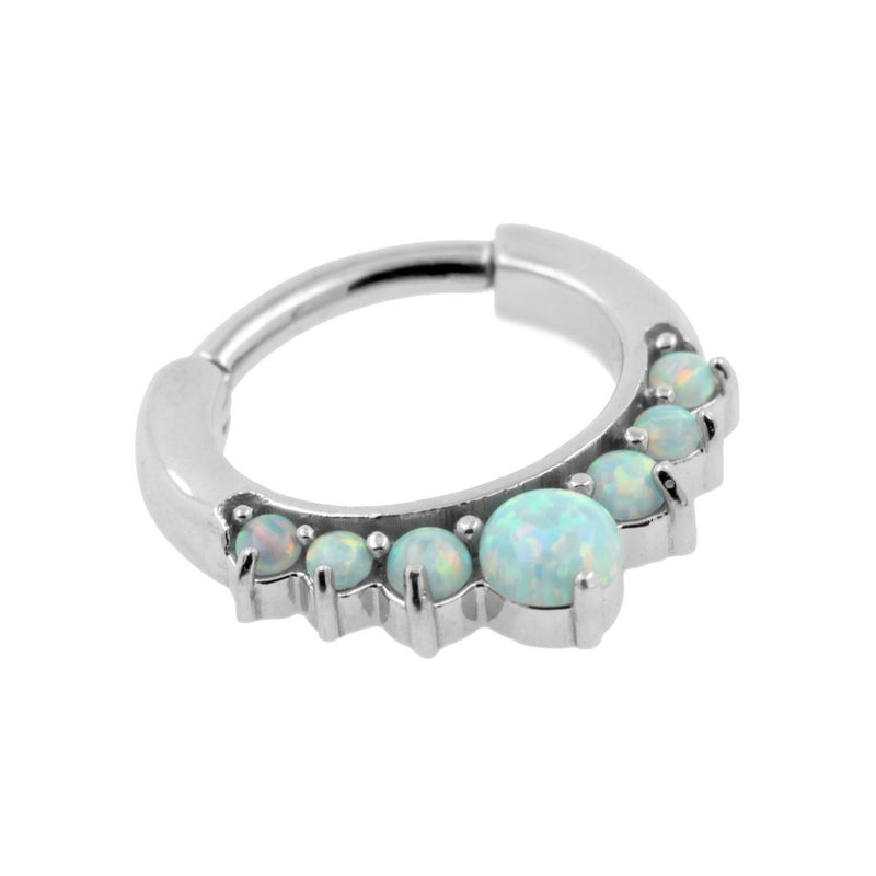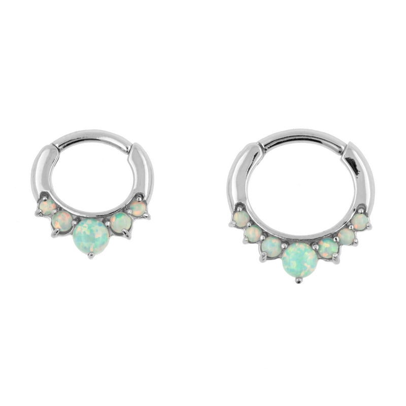 High quality septum ring. This beautiful ring is set with cabochon syntethic opals and has a curved stem. The rings are small for a snug fit around your septum, making them extra fancy. Made of high quality surgical steel with a mirror finish.