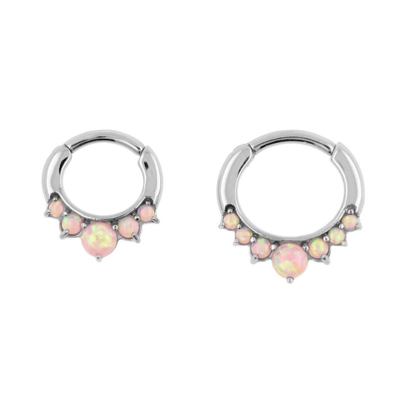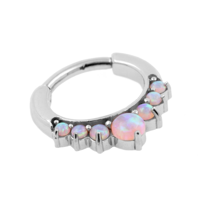 High quality septum ring. This beautiful ring is set with cabochon syntethic opals and has a curved stem. The rings are small for a snug fit around your septum, making them extra fancy. Made of high quality surgical steel with a mirror finish.