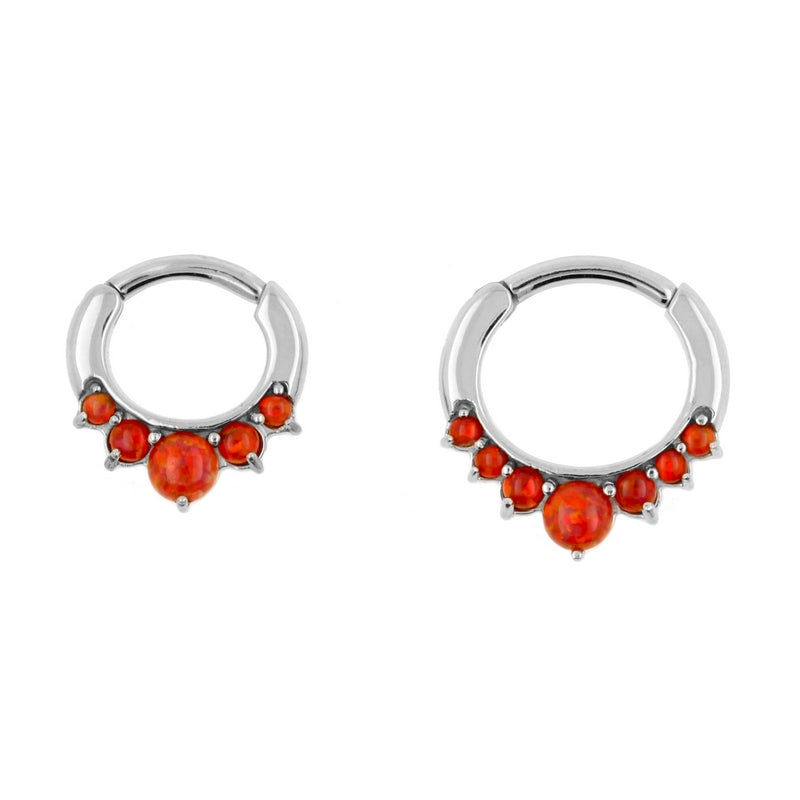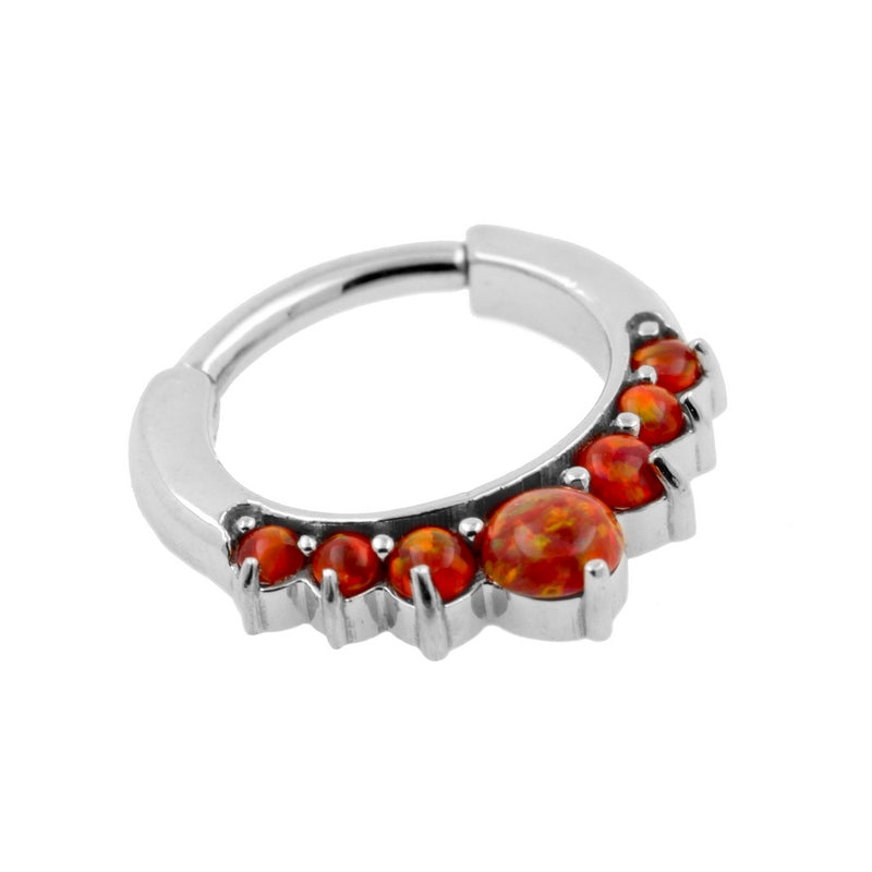 High quality septum ring. This beautiful ring is set with cabochon syntethic opals and has a curved stem. The rings are small for a snug fit around your septum, making them extra fancy. Made of high quality surgical steel with a mirror finish.