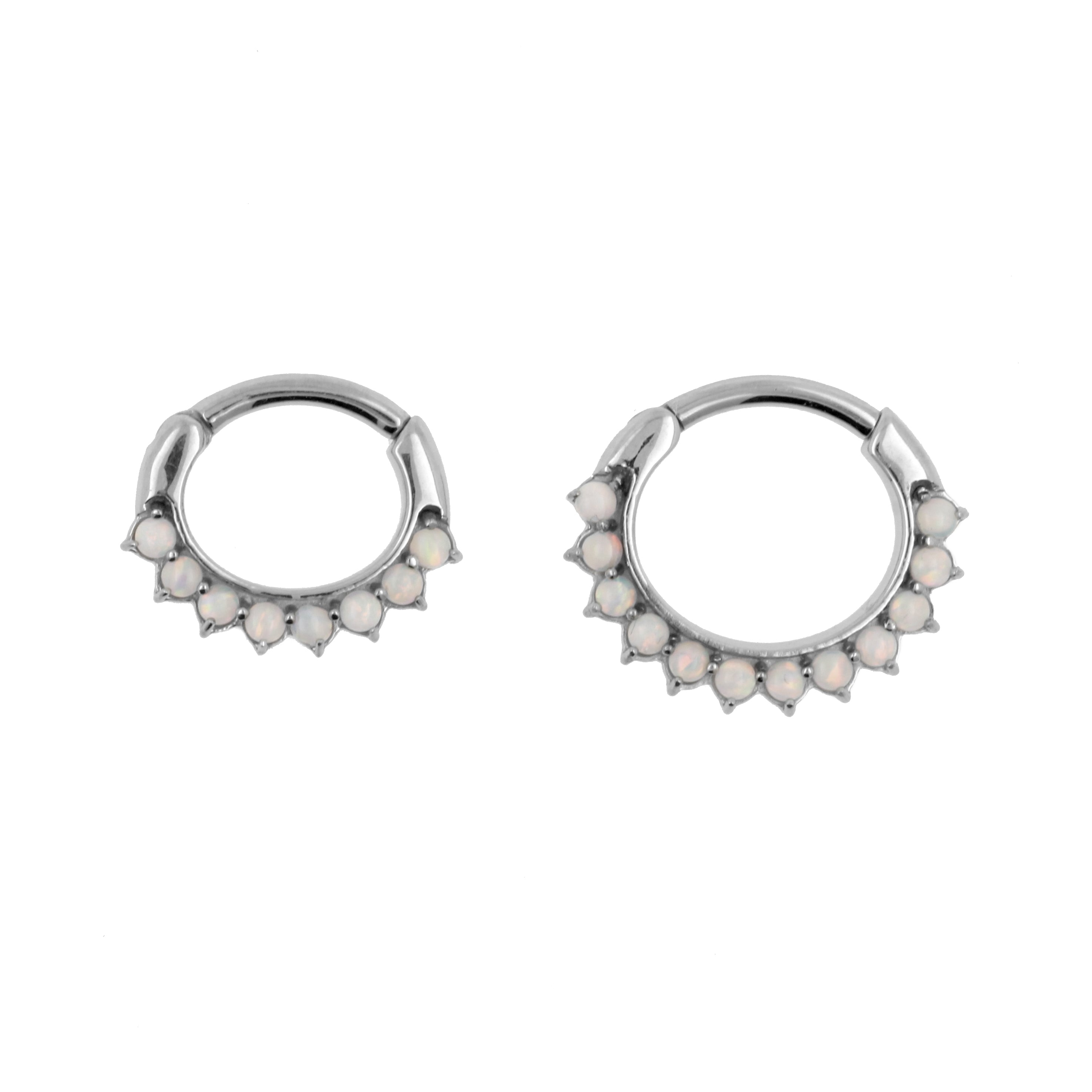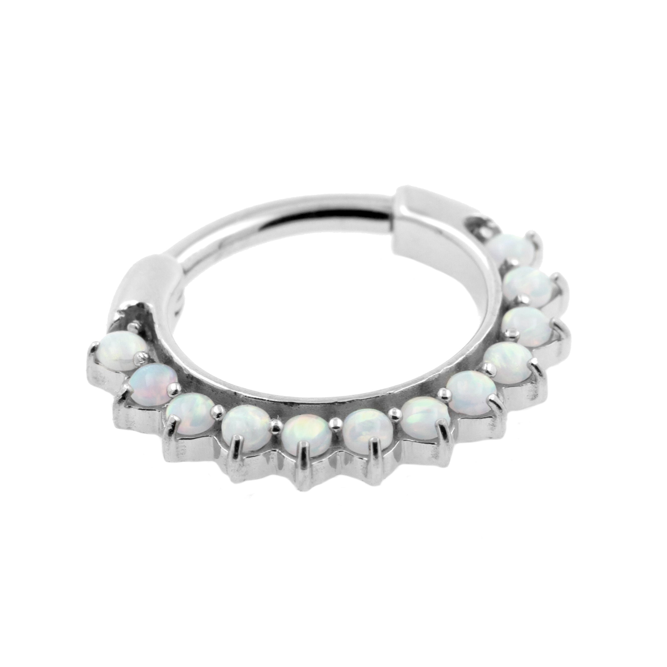 High quality septum ring. This beautiful ring is set with cabochon syntethic opals and has a curved stem. The rings are small for a snug fit around your septum, making them extra fancy. Made of high quality surgical steel with a mirror finish.