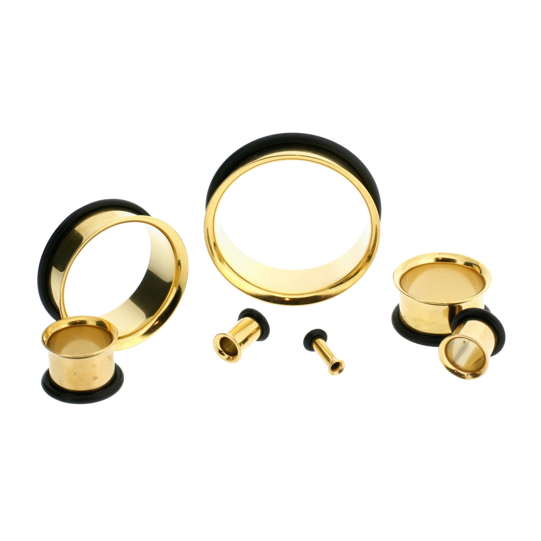 The essential basics for your stretched piercings! Basic, single flared eyelet made of gold P.V.D. coated surgical steel. The single flare allows an easy insertion into your piercings, the accompanied o-ring makes sure the jewelry stays in place.