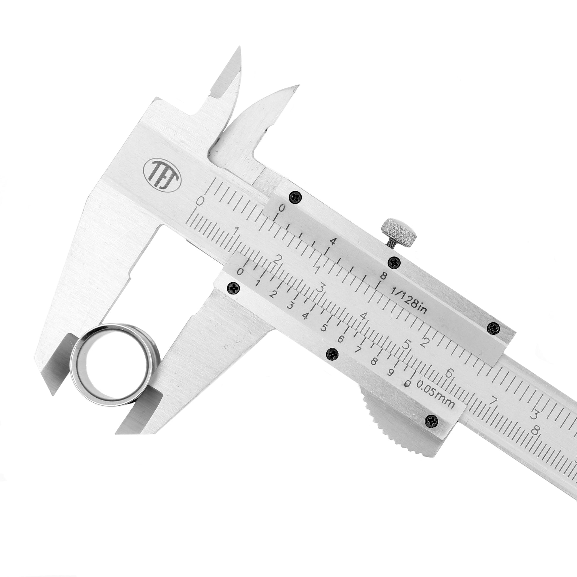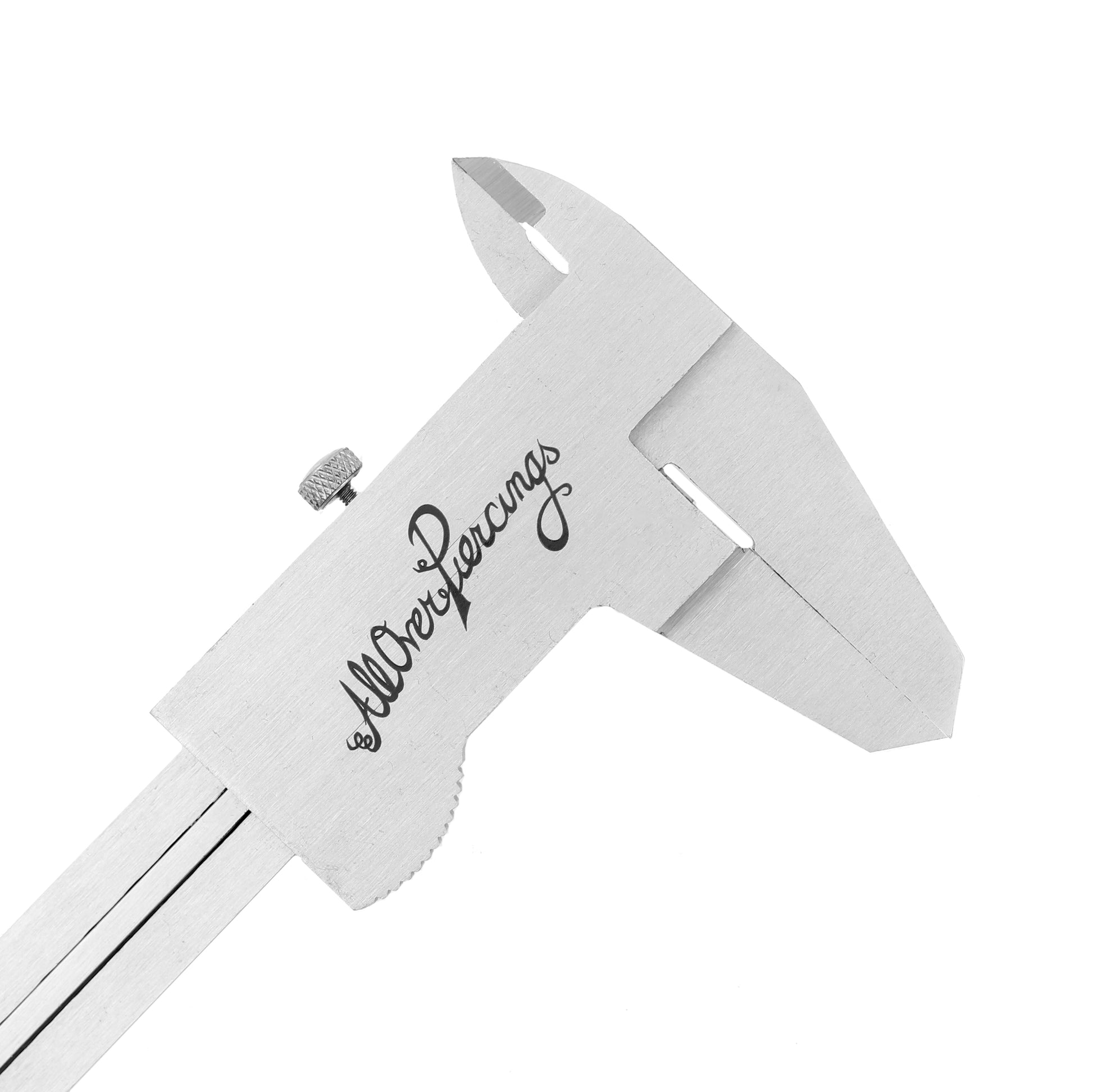 Measure your piercings the easy way! With this easy to use steel caliper you can measure all your piercing jewelry easy and accuratly, no more fussing about with other measuring equipment. Measuring is super easy: open the large outside jaws and fit the part of your jewelry that needs measuring between them. Gently slide the jaws towards each other and check the main scale. There you go, the exact size of your piercing jewelry!