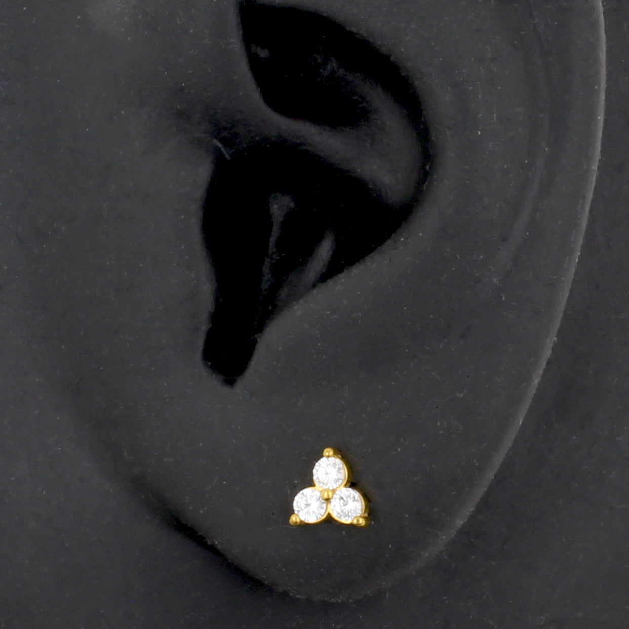 Beautiful trinity ear studs with zirconia, perfect for regular sized earrings! The ear studs are suitable for 0,8 mm earrings and are fitted with a basic, butterfly back for a secure fit. Made of high quality surgical steel and available in lots of different designs. The perfect jewelry to complete your earparty!