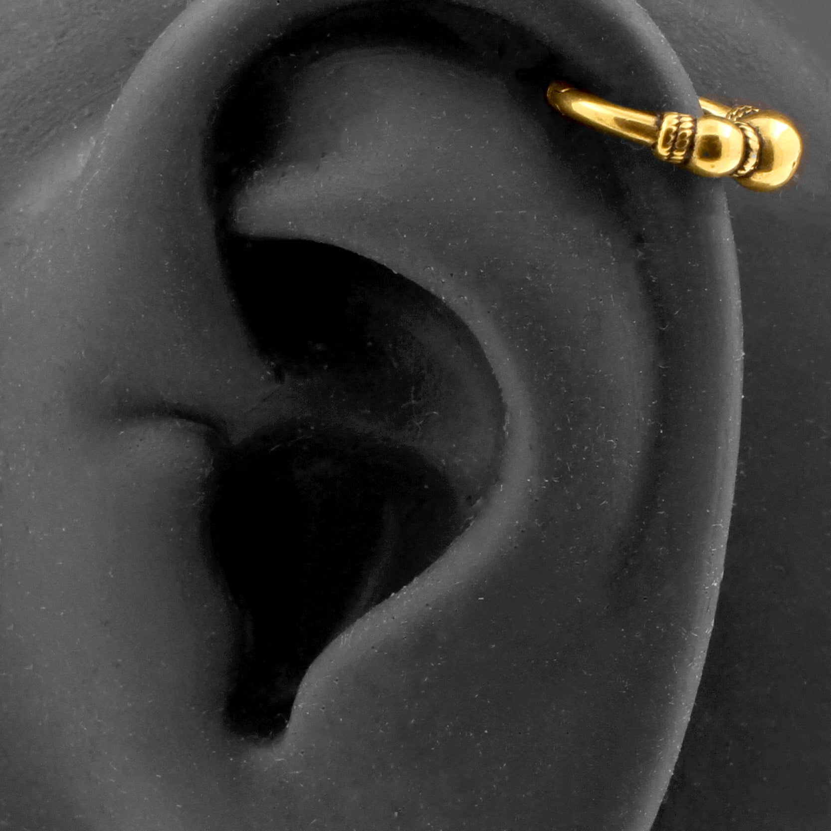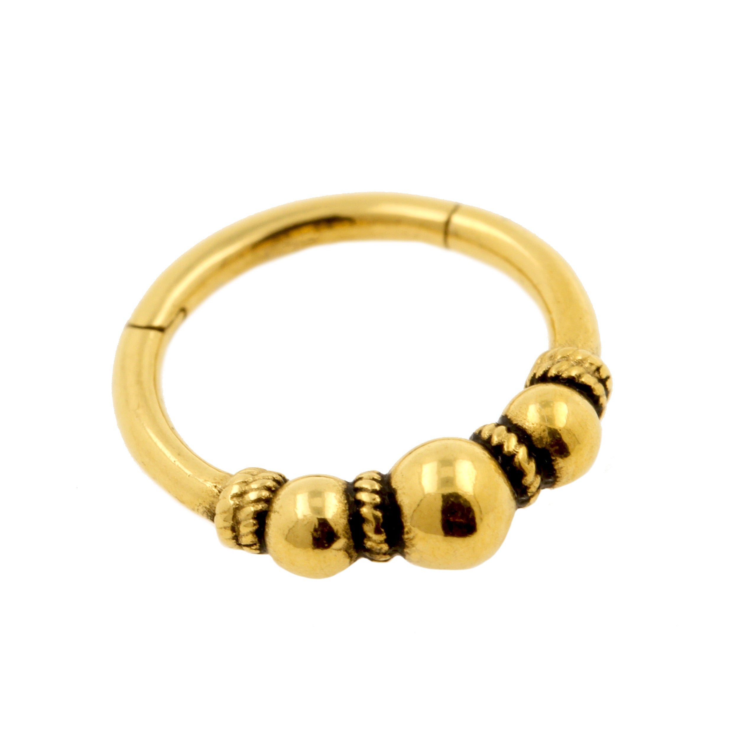 High quality piercing ring with easy to use clicking mechanism! This beautiful ring is features beautiful, vintage style decoration and has a curved stem. The rings suitable for all kinds of piercings, giving them an extra fancy look in an instant. Made of high quality surgical steel with a mirror finish and available in different colors and designs.