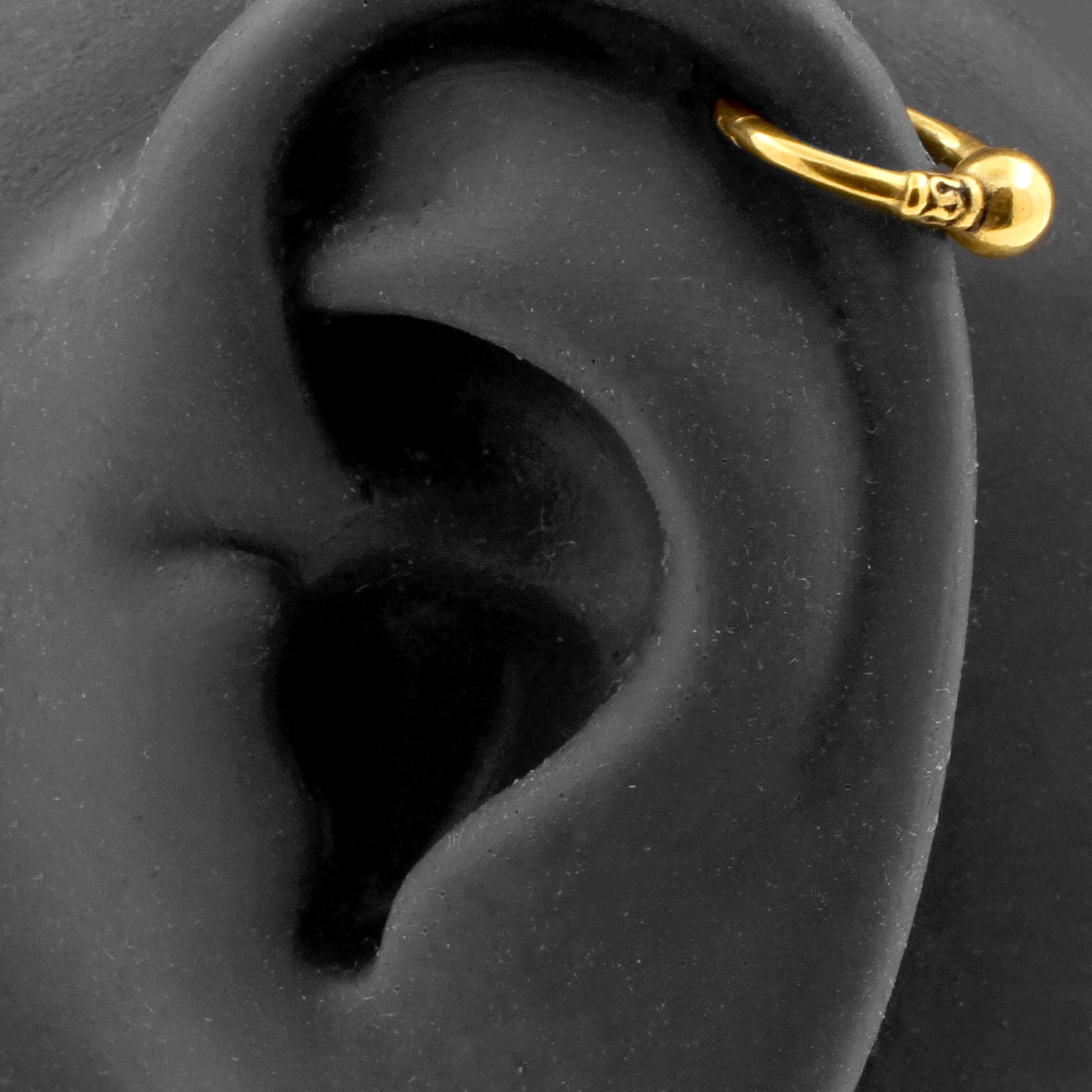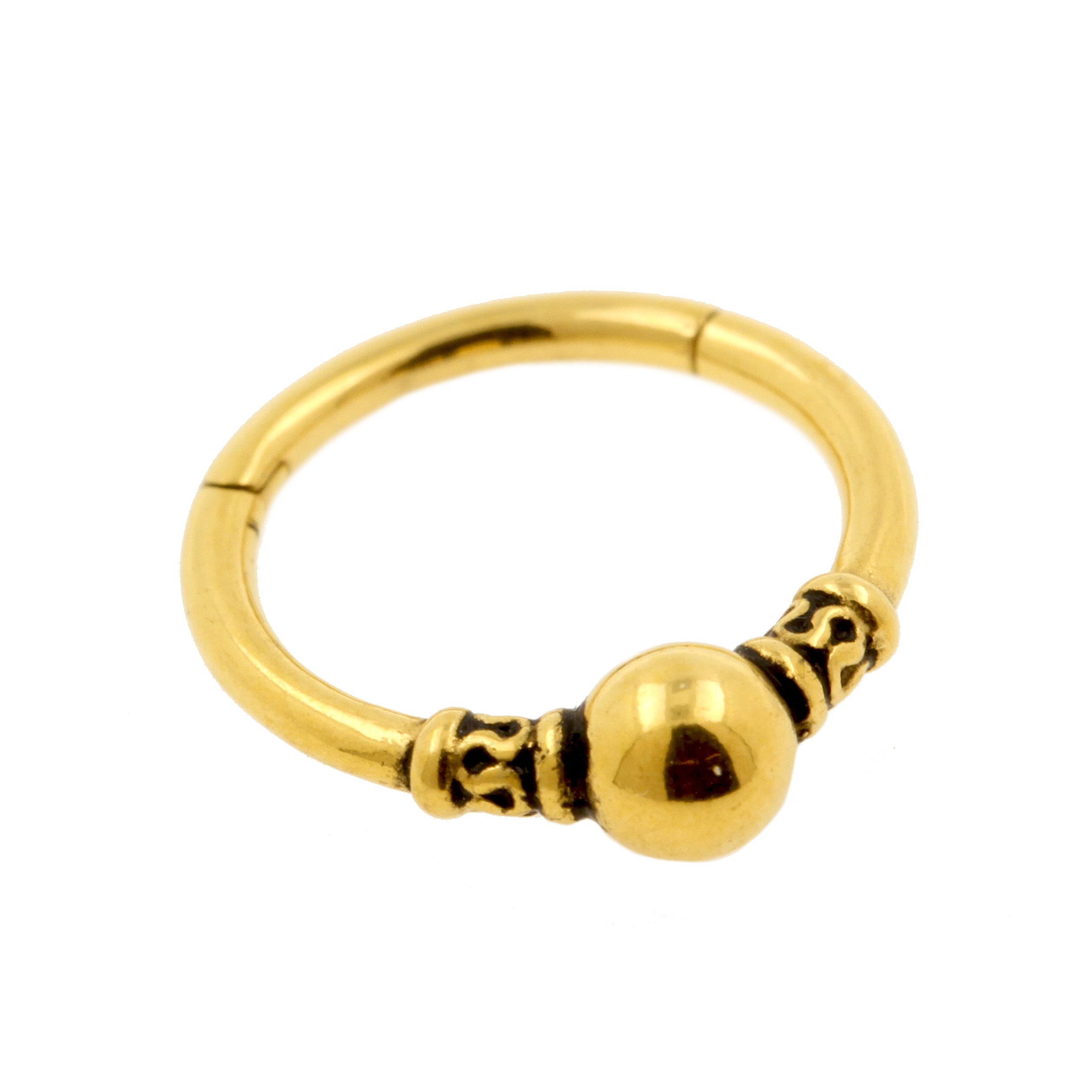 High quality piercing ring with easy to use clicking mechanism! This beautiful ring is features beautiful, vintage style decoration and has a curved stem. The rings suitable for all kinds of piercings, giving them an extra fancy look in an instant. Made of high quality surgical steel with a mirror finish and available in different colors and designs.