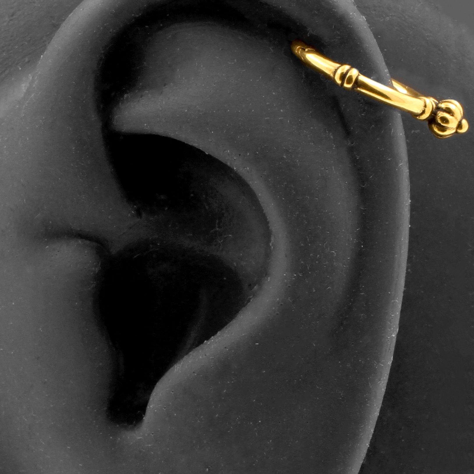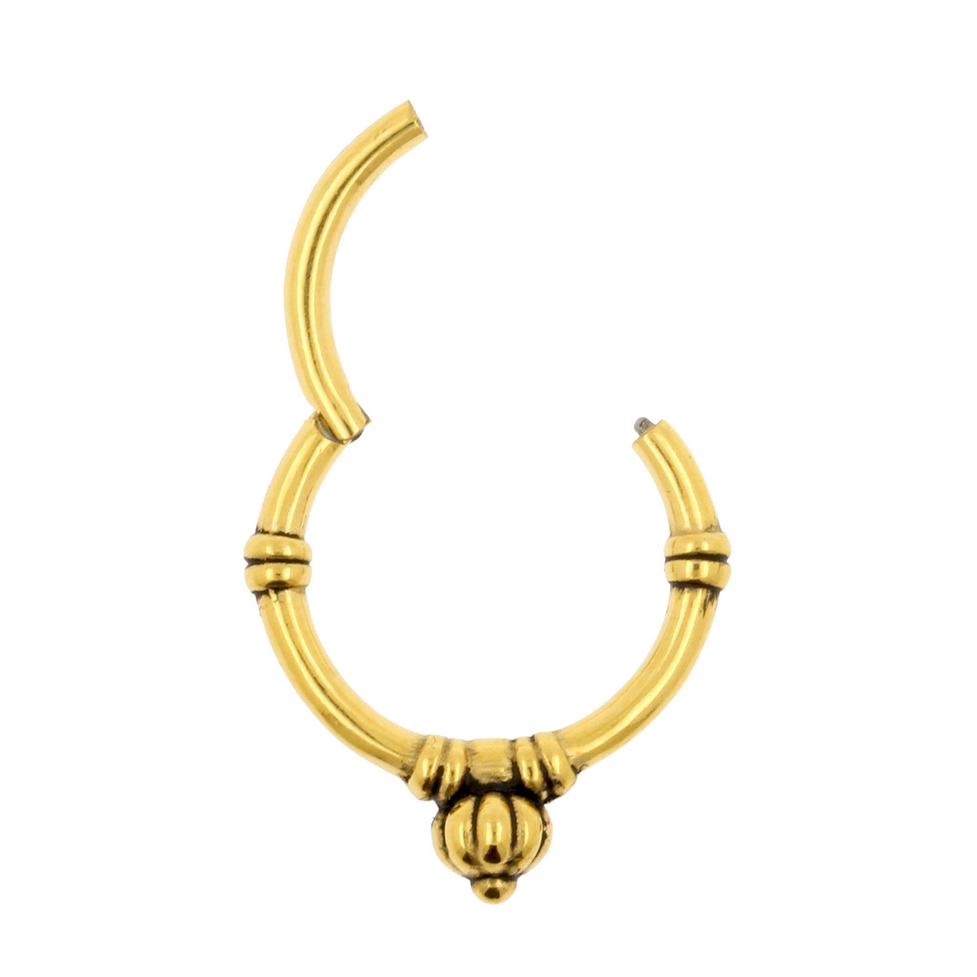 High quality piercing ring with easy to use clicking mechanism! This beautiful ring is features beautiful, vintage style decoration and has a curved stem. The rings suitable for all kinds of piercings, giving them an extra fancy look in an instant. Made of high quality surgical steel with a mirror finish and available in different colors and designs.
