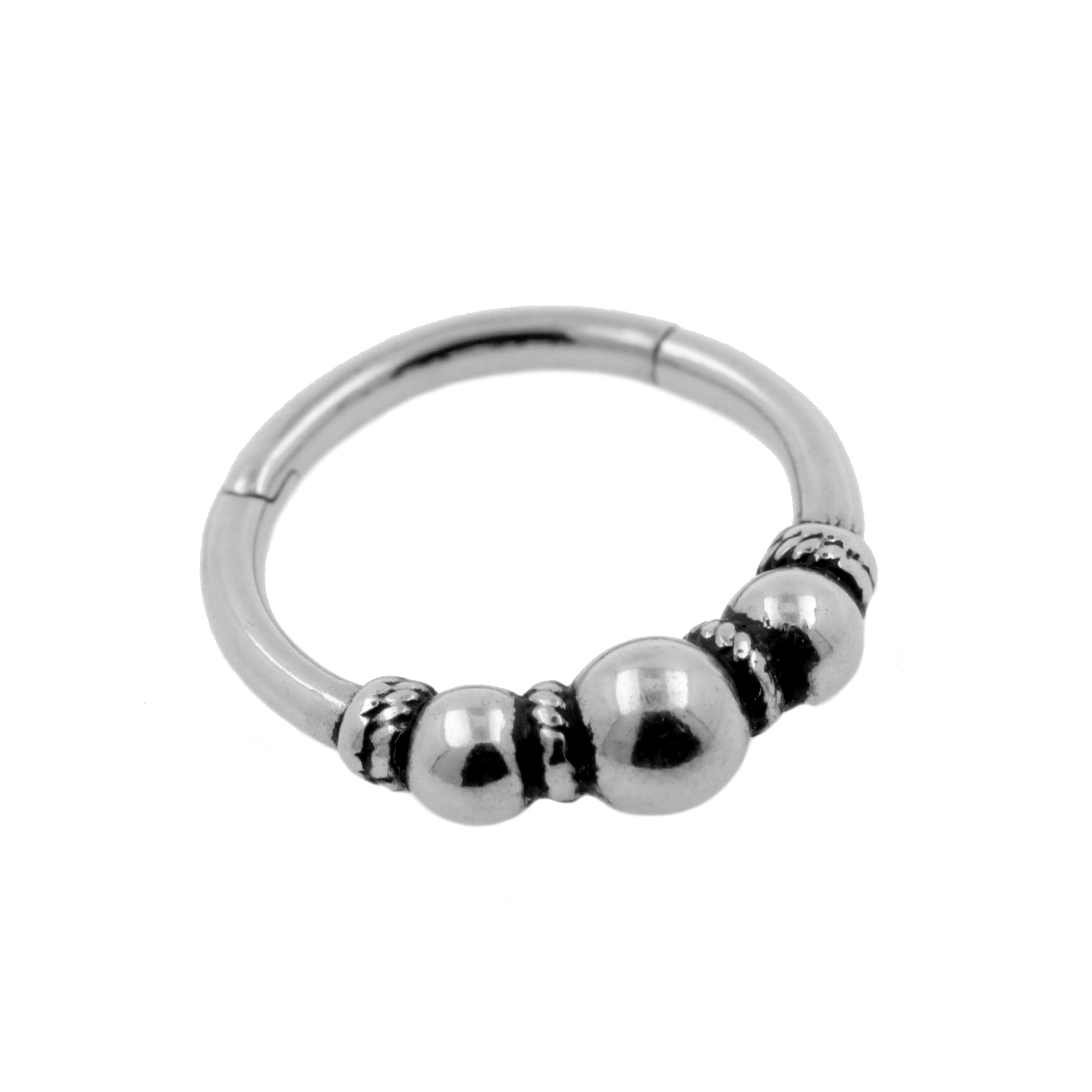 High quality piercing ring with easy to use clicking mechanism! This beautiful ring is features beautiful, vintage style decoration and has a curved stem. The rings suitable for all kinds of piercings, giving them an extra fancy look in an instant. Made of high quality surgical steel with a mirror finish and available in different colors and designs.