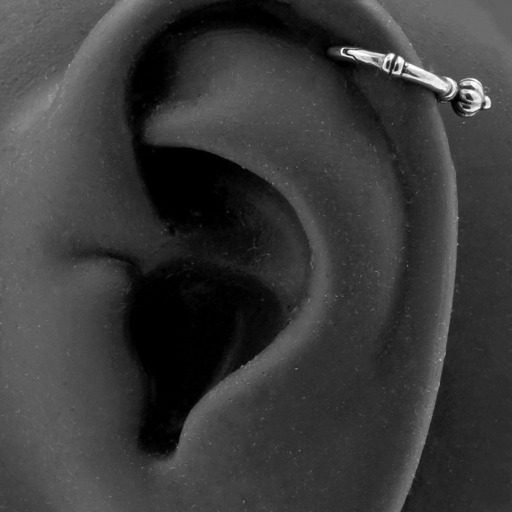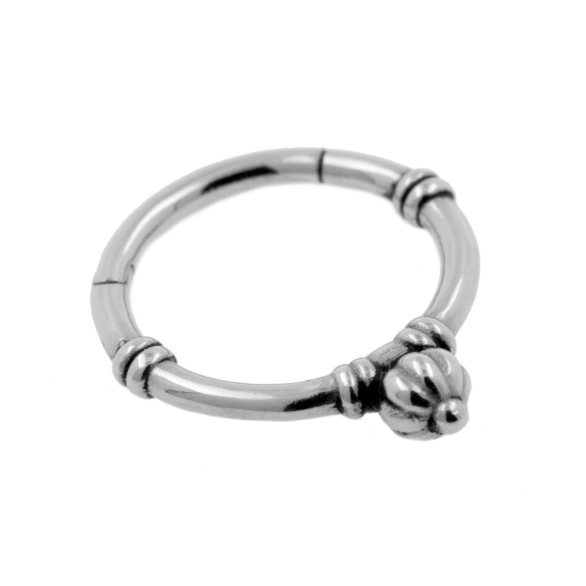 High quality piercing ring with easy to use clicking mechanism! This beautiful ring is features beautiful, vintage style decoration and has a curved stem. The rings suitable for all kinds of piercings, giving them an extra fancy look in an instant. Made of high quality surgical steel with a mirror finish and available in different colors and designs.