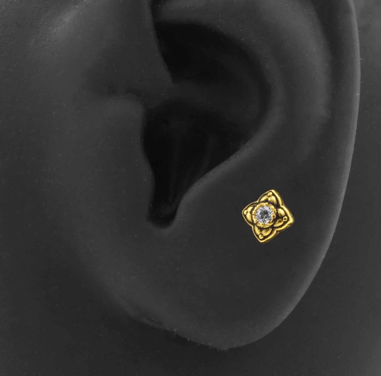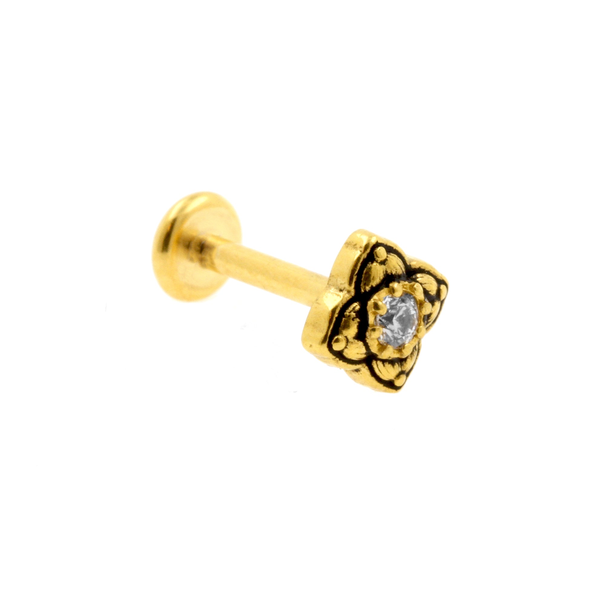 Complete your earparty and other piercings with our beautiful labret studs! These internally threaded labrets measure 1,2 mm in thickness and are available in different lengths, perfect for all kinds of piercings. The front of each labret is set with a beautiful design with genuine zirconia. Made of high quality surgical steel with gold P.V.D. coating and fitted with internal thread, which makes changing your jewelry a lot more comfortable. Please note that due to the unique shape of the attachment, changing jewelry might be a bit more challenging. But practice makes perfect and it will all be more than worth it in the end, because our labret studs will turn your piercings into real eyecatchers! (Extra info: the thread of this jewelry measures 0,8 mm in thickness and is compatible with other 1,2 mm internally threaded piercing jewelry and accessories from our shop.)