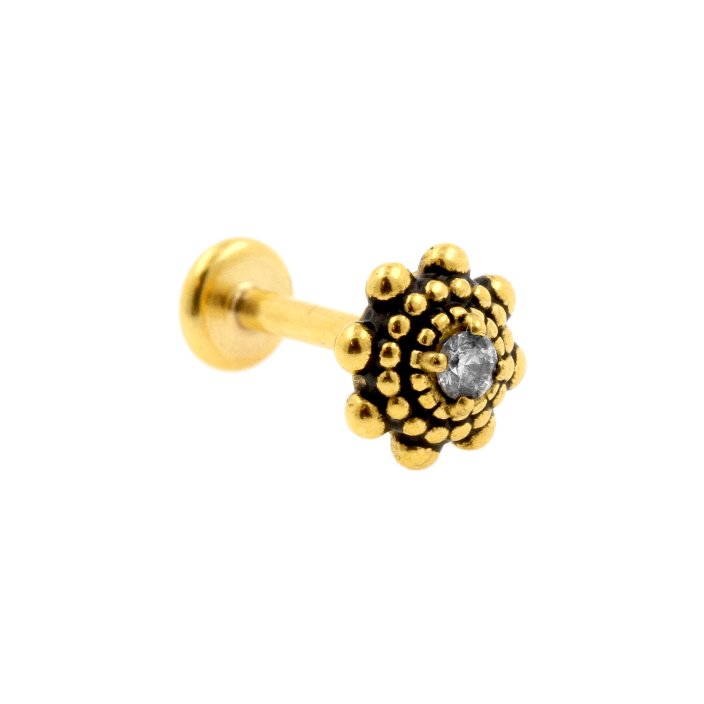 Complete your earparty and other piercings with our beautiful labret studs! These internally threaded labrets measure 1,2 mm in thickness and are available in different lengths, perfect for all kinds of piercings. The front of each labret is set with a beautiful design with genuine zirconia. Made of high quality surgical steel with gold P.V.D. coating and fitted with internal thread, which makes changing your jewelry a lot more comfortable. Please note that due to the unique shape of the attachment, changing jewelry might be a bit more challenging. But practice makes perfect and it will all be more than worth it in the end, because our labret studs will turn your piercings into real eyecatchers! (Extra info: the thread of this jewelry measures 0,8 mm in thickness and is compatible with other 1,2 mm internally threaded piercing jewelry and accessories from our shop.)