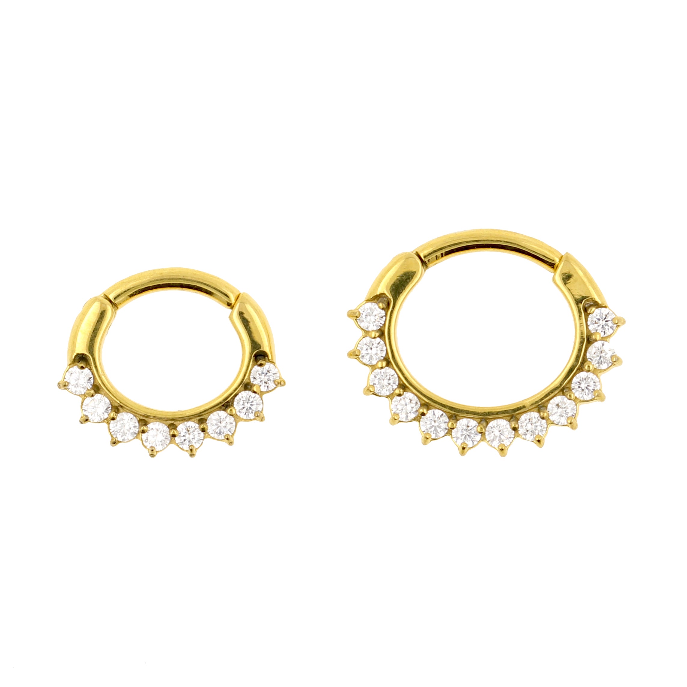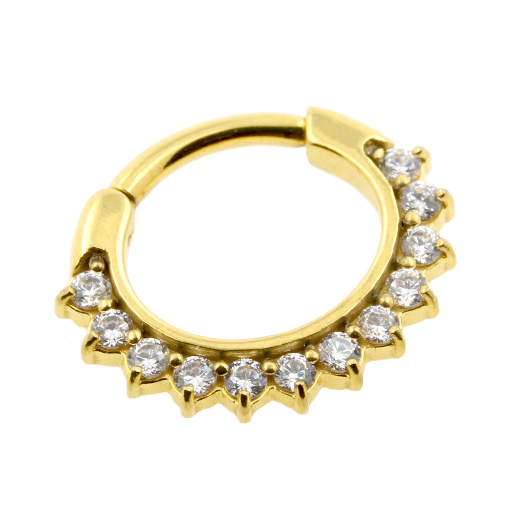 High quality septum ring. This beautiful ring is set with bright, shiny cubic zirconia gems and has a curved stem. The rings are small for a snug fit around your septum, making them extra fancy. Made of high quality surgical steel with a mirror finish.