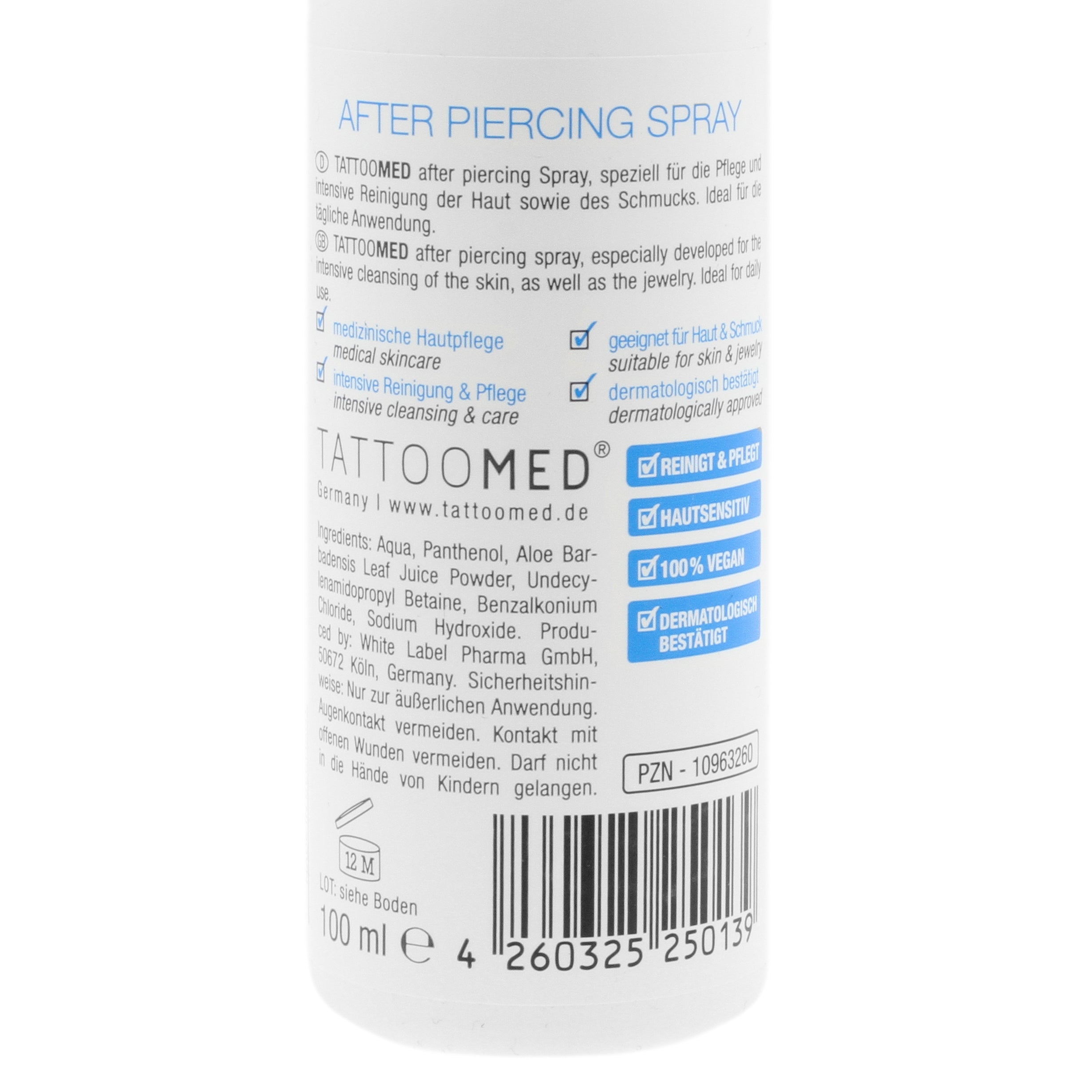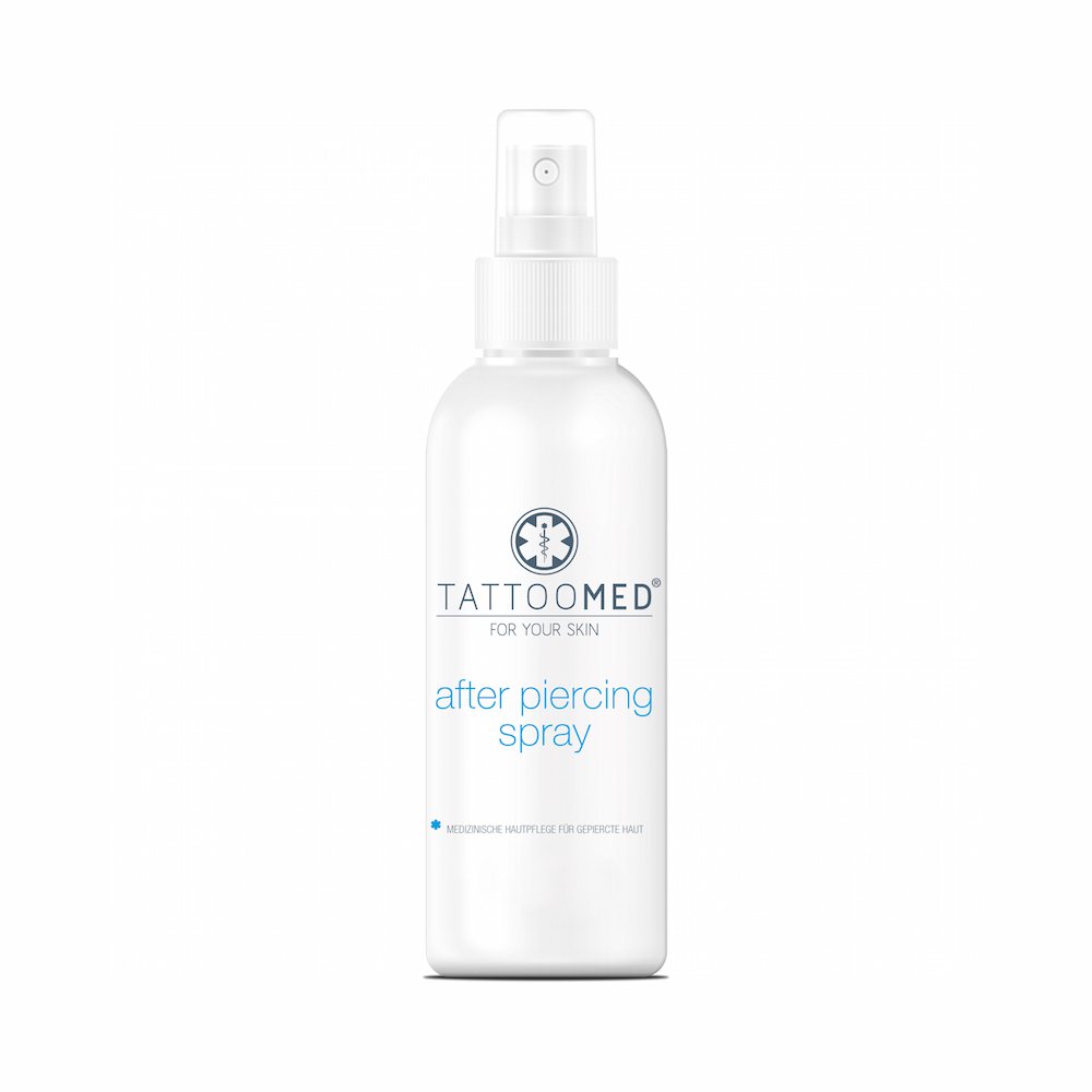 Vegan piercing aftercare van TattooMed! De After Piercing spray van TattooMed is een supermakkelijk te gebruiken piercing spray die je direct op je verse piercing kunt sprayen. De verzorgende bestanddelen bevorderen de genezing, helpen de wondomgeving schoon te houden en de toegevoegde Panthenol helpt jeuk en irritatie te verminderen. De spray prikt niet en houdt je huid soepel en gehydrateerd. After Piercing spray is ook prima te gebruiken voor de reiniging van je piercingsieraden! Vrij van parabenen en niet getest op dieren.