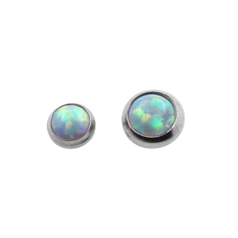Make 'm shine! Turn your  piercings into something stunning with these beautiful Cabochon Opal Discs. These titanium discs are set with cabochon-cut, synthetic opal. The rounded cut makes the opalescent colors really stand out, turning your piercings into little eye-catchers. These Opal Discs are suitable for 1,2 mm internally threaded jewelry (the threading itself measures 0,8mm). Available in different diameters and 5 different colors.
