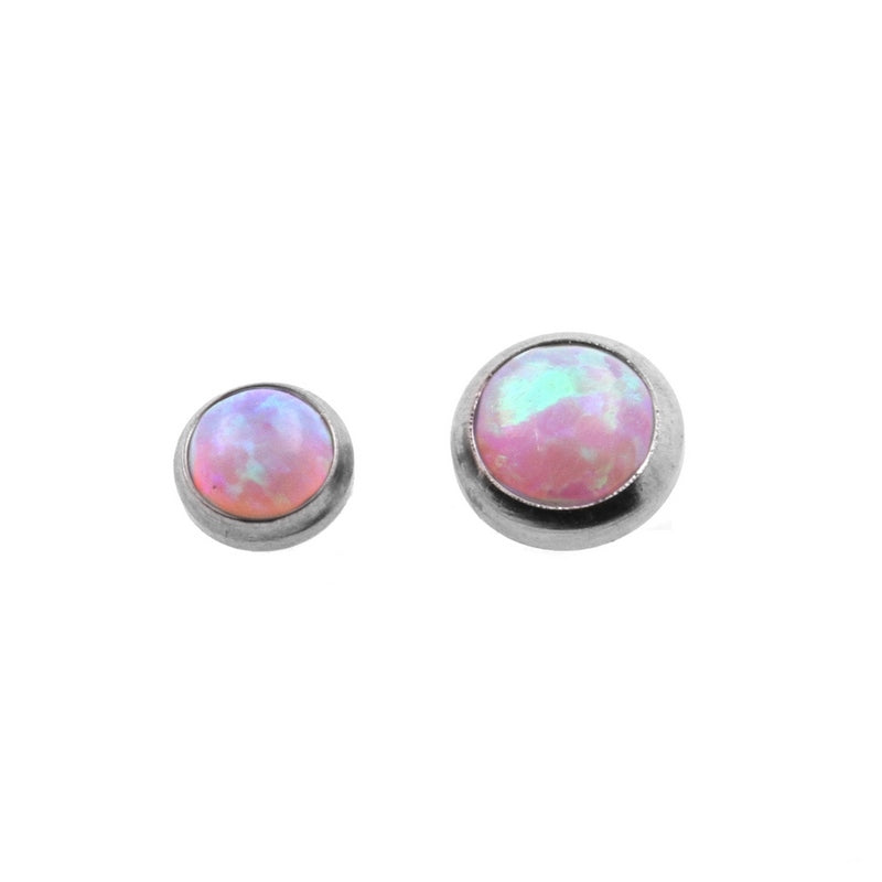 Make 'm shine! Turn your  piercings into something stunning with these beautiful Cabochon Opal Discs. These titanium discs are set with cabochon-cut, synthetic opal. The rounded cut makes the opalescent colors really stand out, turning your piercings into little eye-catchers. These Opal Discs are suitable for 1,2 mm internally threaded jewelry (the threading itself measures 0,8mm). Available in different diameters and 5 different colors.