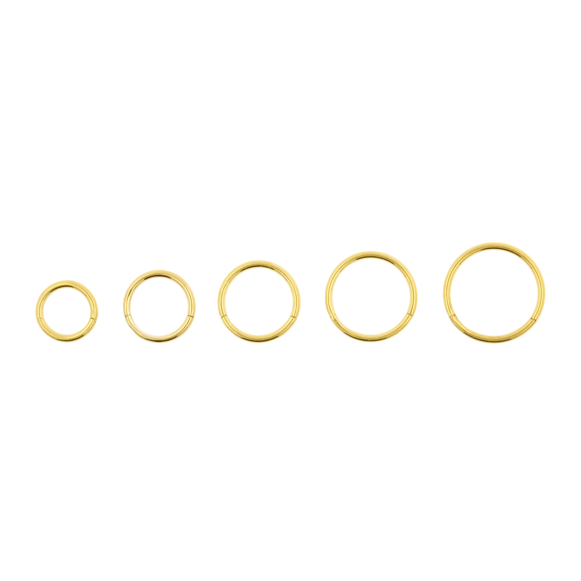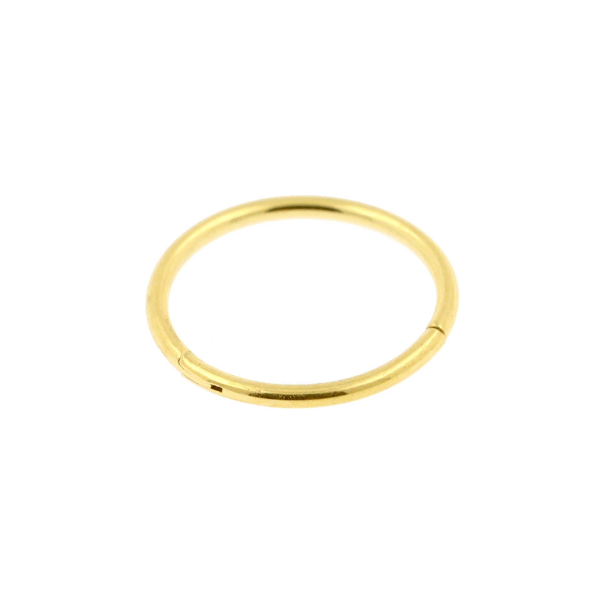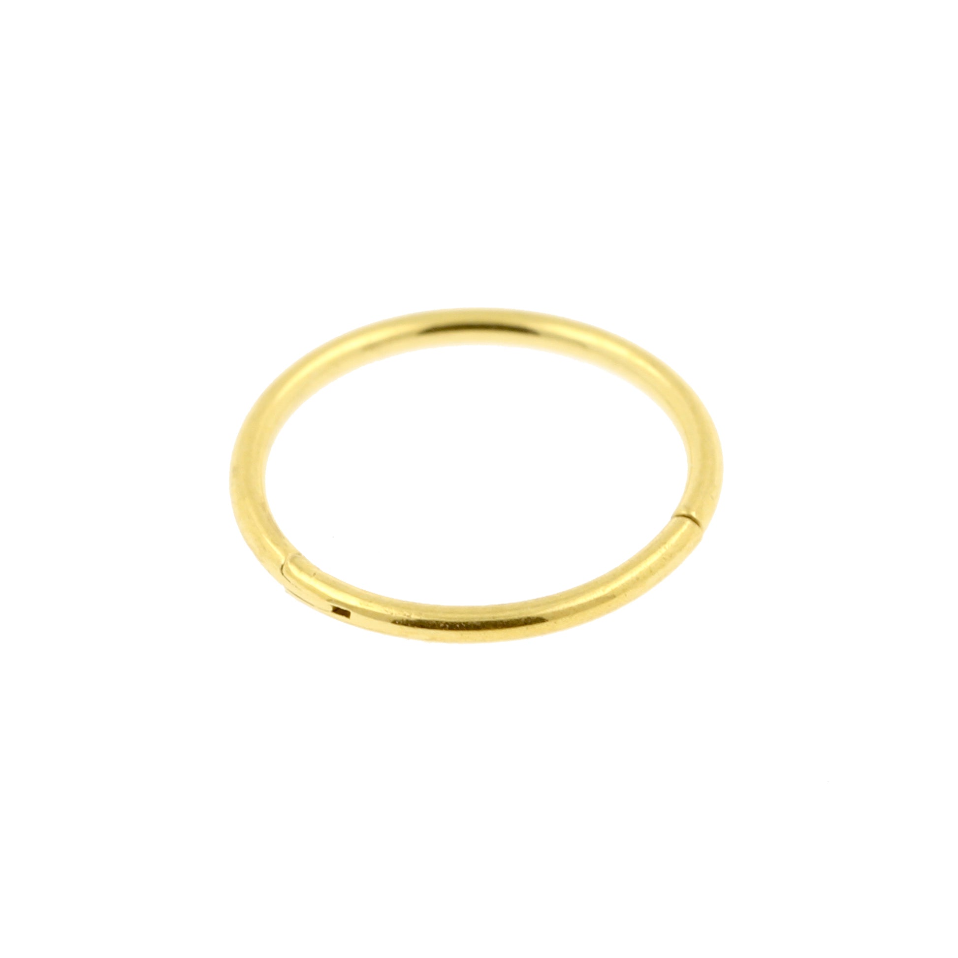 Pretty basics! The perfect piercing ring if you like the look of a smooth segment ring, but need something that's easy to use as well. The segment of this click ring is hinged and can easily be opened and closed. The closing mechanism is very easy to use and allows a smooth insertion into your piercings. Made of gold colored and nickelfree titanium and available in different colors and sizes!