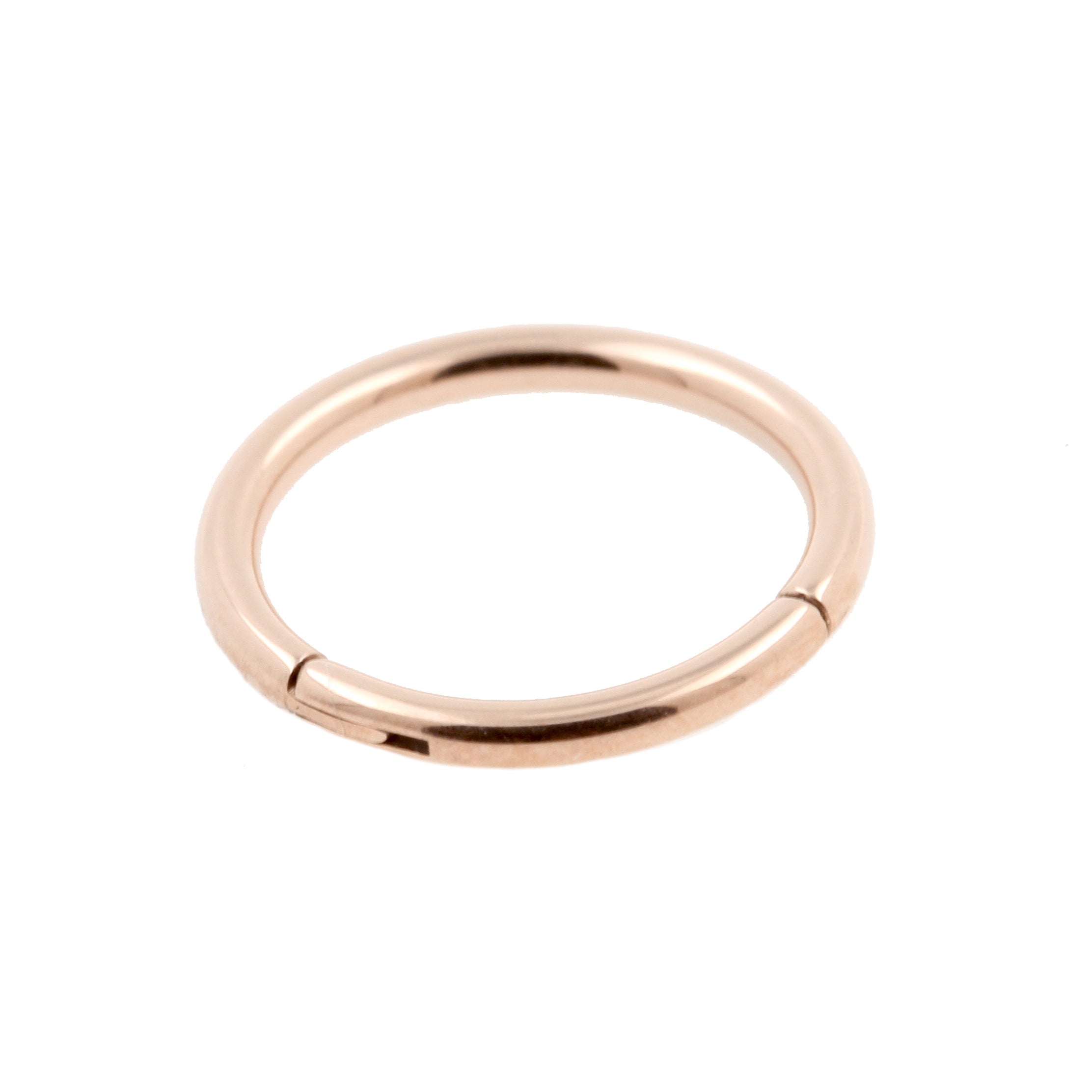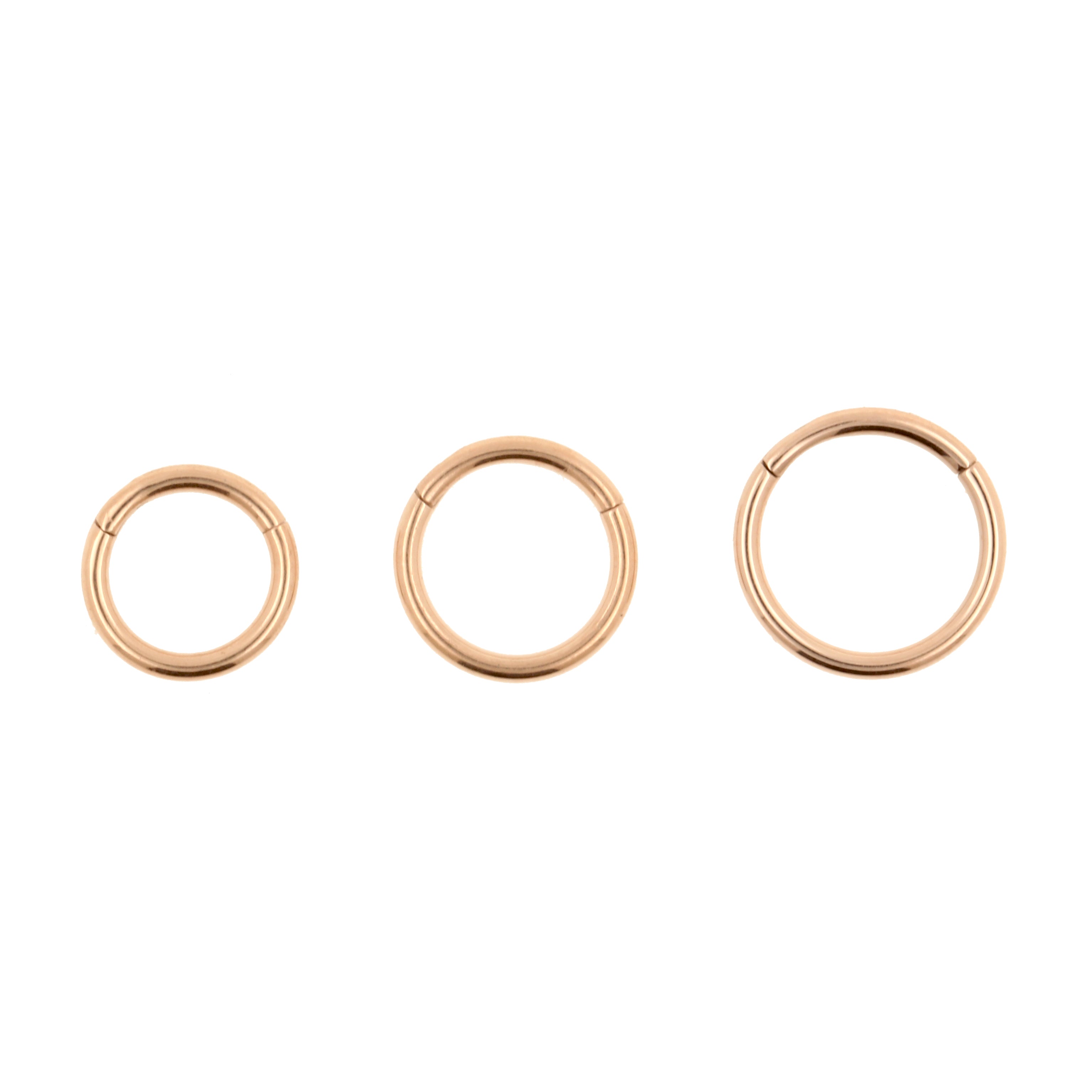 Pretty basics! The perfect piercing ring if you like the look of a smooth segment ring, but need something that's easy to use as well. The segment of this click ring is hinged and can easily be opened and closed. The closing mechanism is very easy to use and allows a smooth insertion into your piercings. Made of rosegold coated nickelfree titanium and available in different colors and sizes!