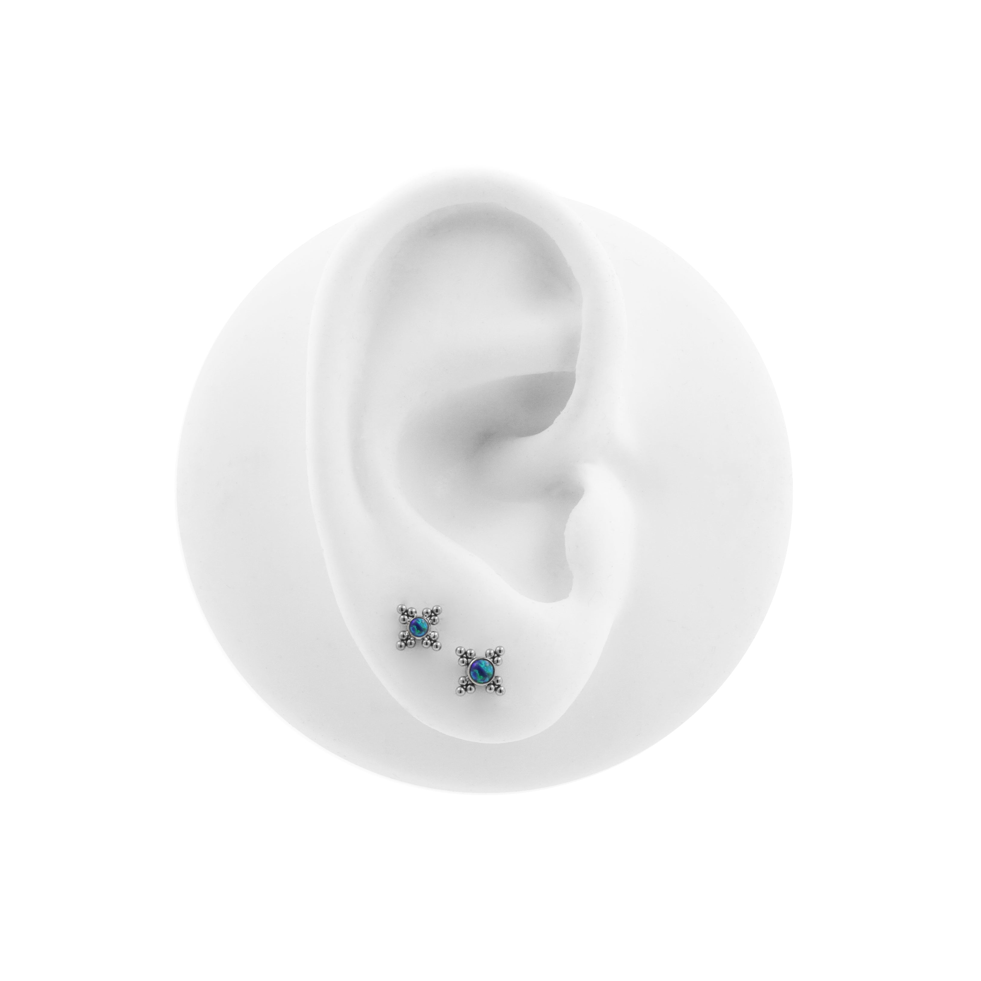 Titanium Opal Cluster - Black Opal instantly adds a stylish touch to your piercing. This Threadless Top is made of Titanium with a synthetic opal in Black Opal. The threadless system allows you to easily combine this top with all our bars, which we call Threadless Base, for a perfect fit and ultimate comfort.