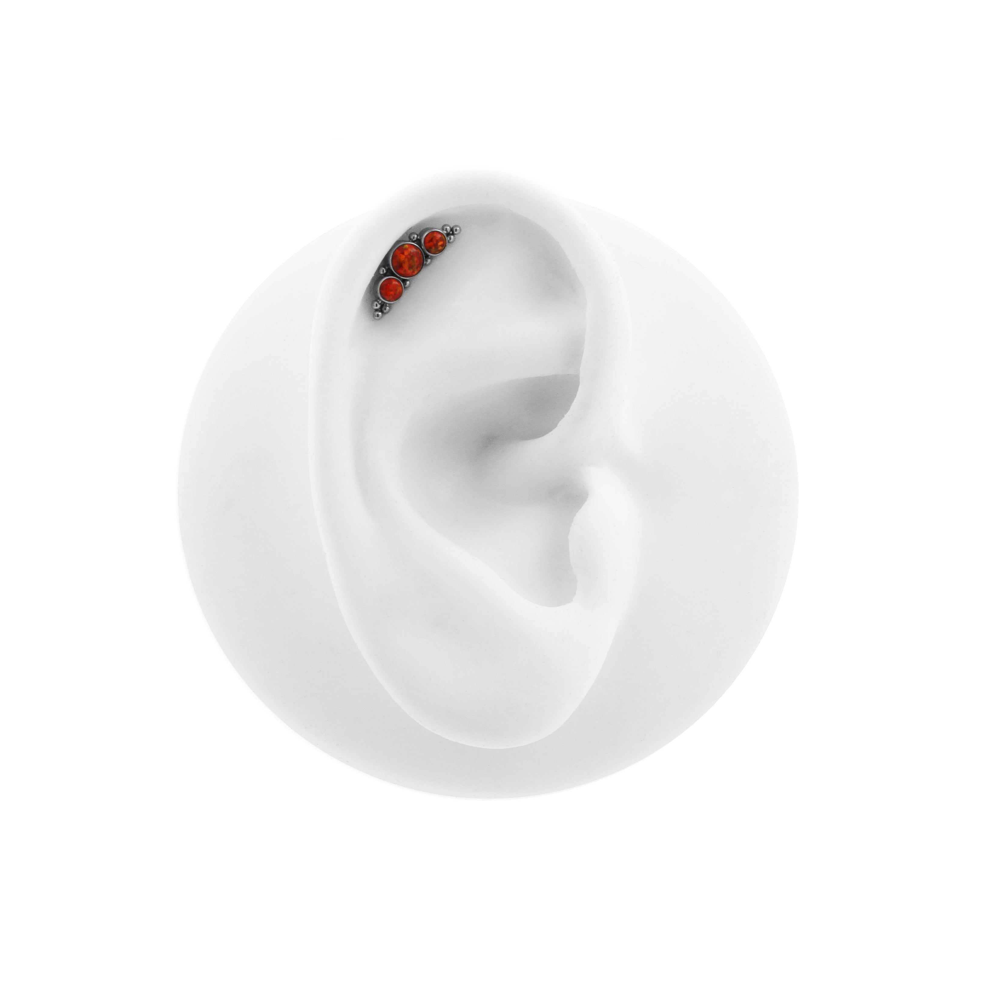 Titanium Opal Cluster - Red Opal instantly adds a stylish touch to your piercing. This Threadless Top is made of Titanium with a synthetic opal in Red Opal. The threadless system allows you to easily combine this top with all our bars, which we call Threadless Base, for a perfect fit and ultimate comfort.