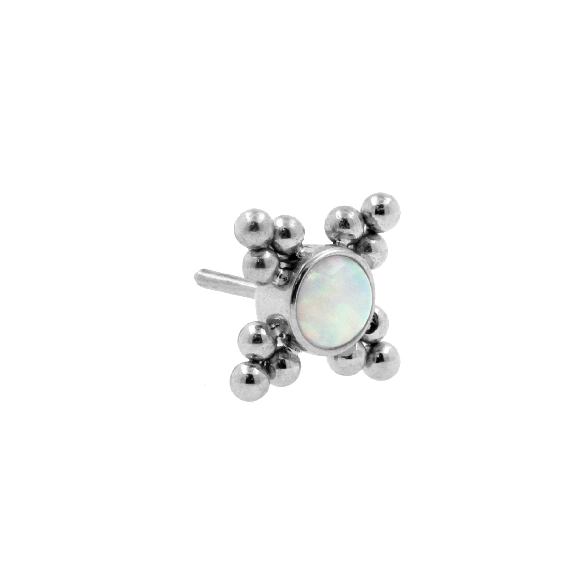 Titanium Opal Cluster - White Opal instantly adds a stylish touch to your piercing. This Threadless Top is made of Titanium. The threadless system allows you to easily combine this top with all our bars, which we call Threadless Base, for a perfect fit and ultimate comfort.