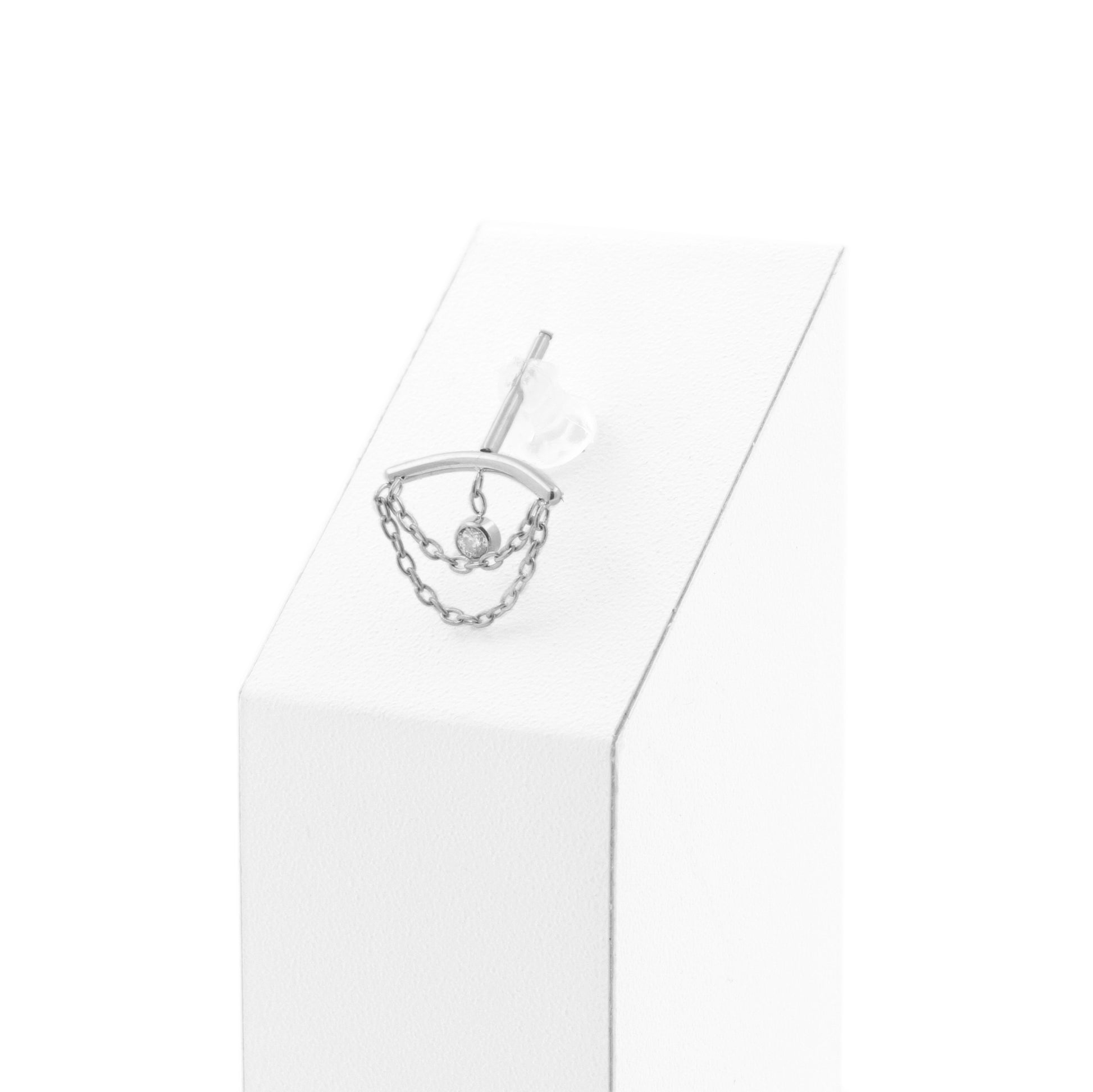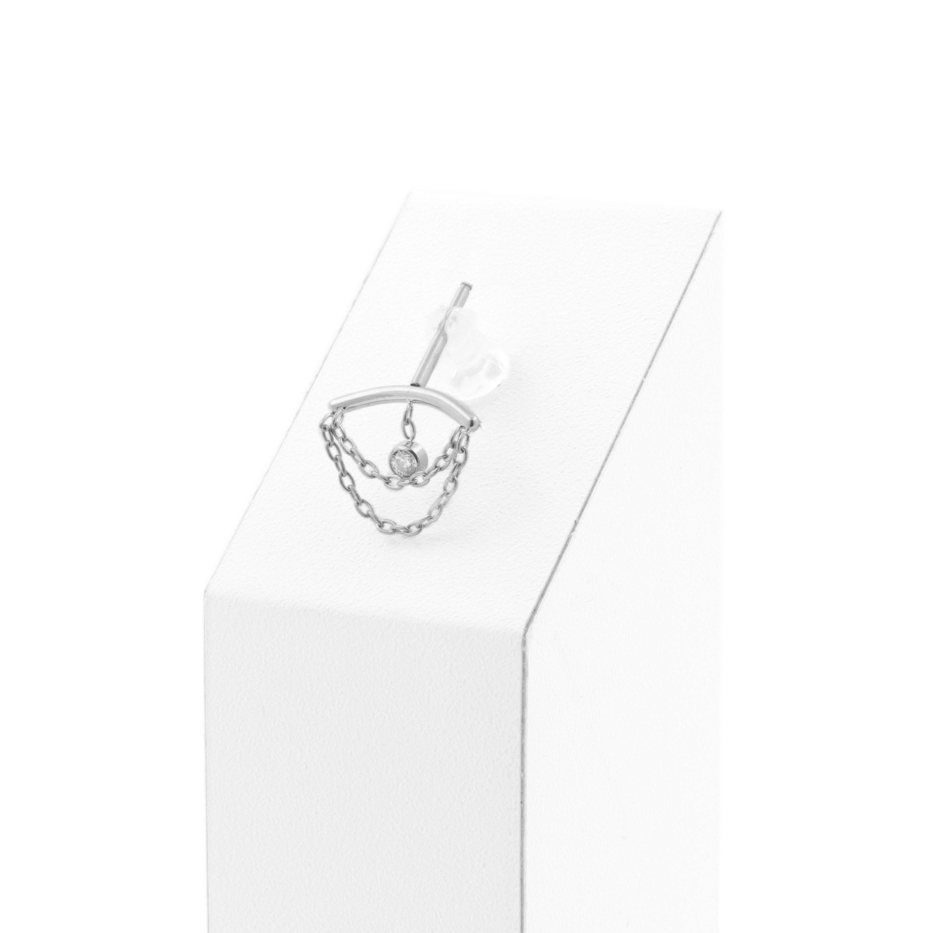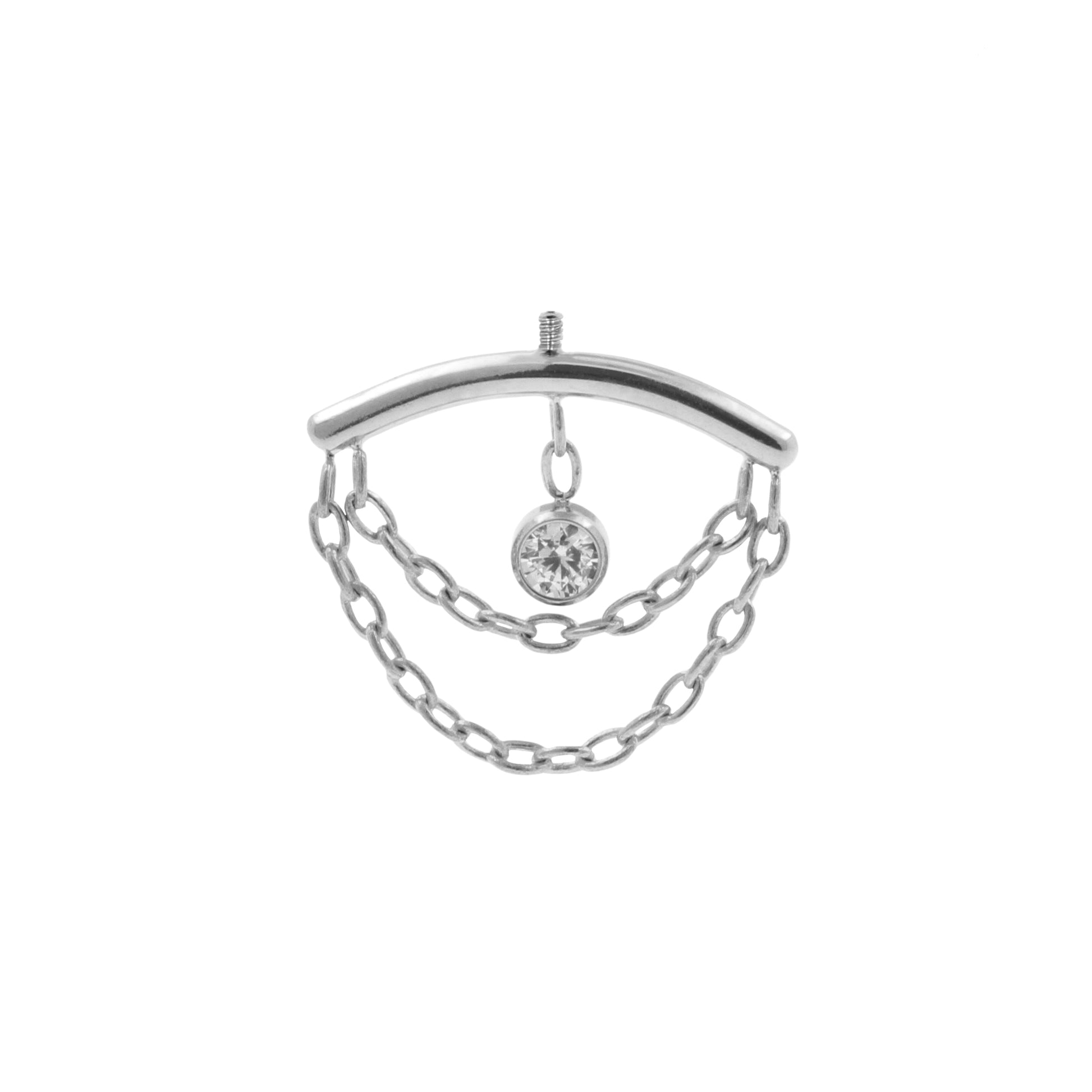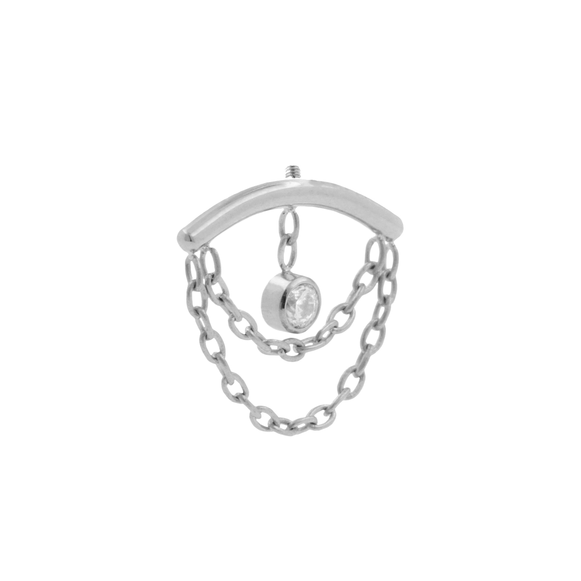 Give your vertical helix piercing an elegant look with this titanium curve, featuring dangling sparkling clear cubic zirconia. The titanium is finished with silver-colored PVD CoCr coating with the look of white gold (nickel-free). This piece is internally threaded and compatible with 1.2 mm internally threaded bars, ensuring safe and comfortable wear.