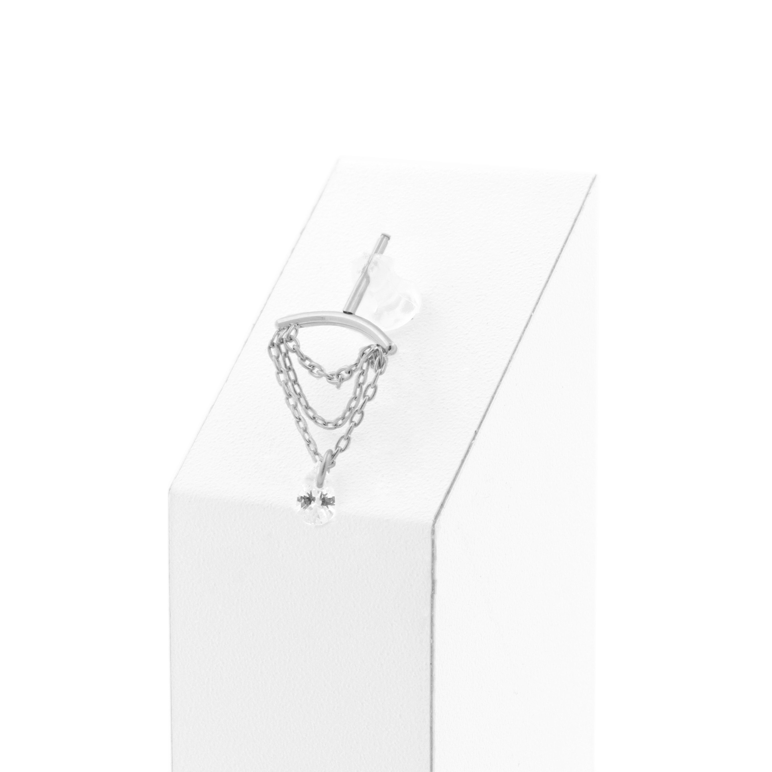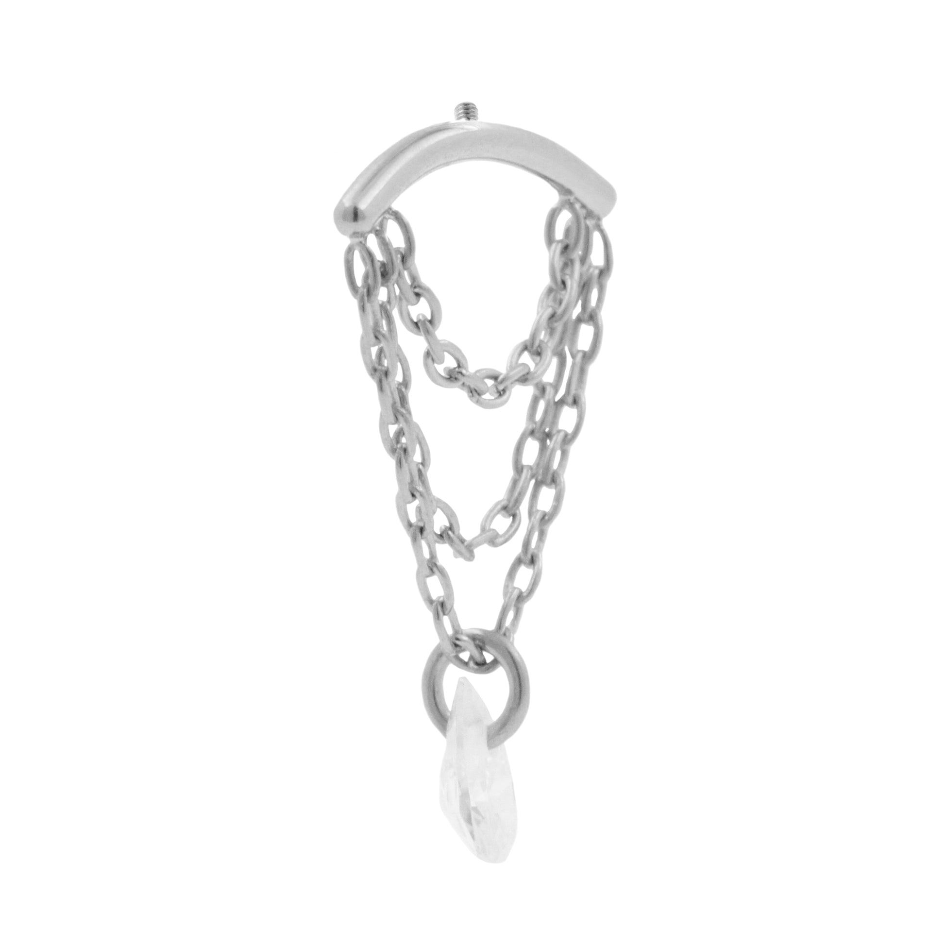 Give your vertical helix piercing an elegant look with this titanium curve, featuring dangling sparkling clear cubic zirconia. The titanium is finished with silver-colored PVD CoCr coating with the look of white gold (nickel-free). This piece is internally threaded and compatible with 1.2 mm internally threaded bars, ensuring safe and comfortable wear.