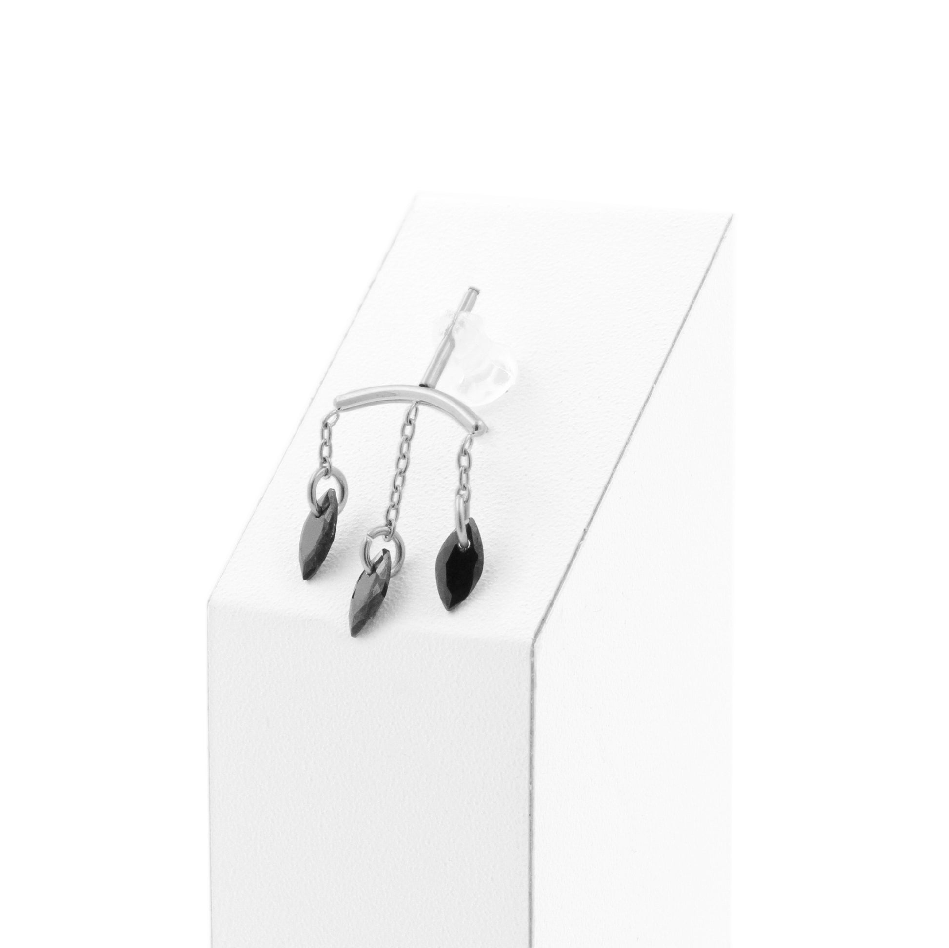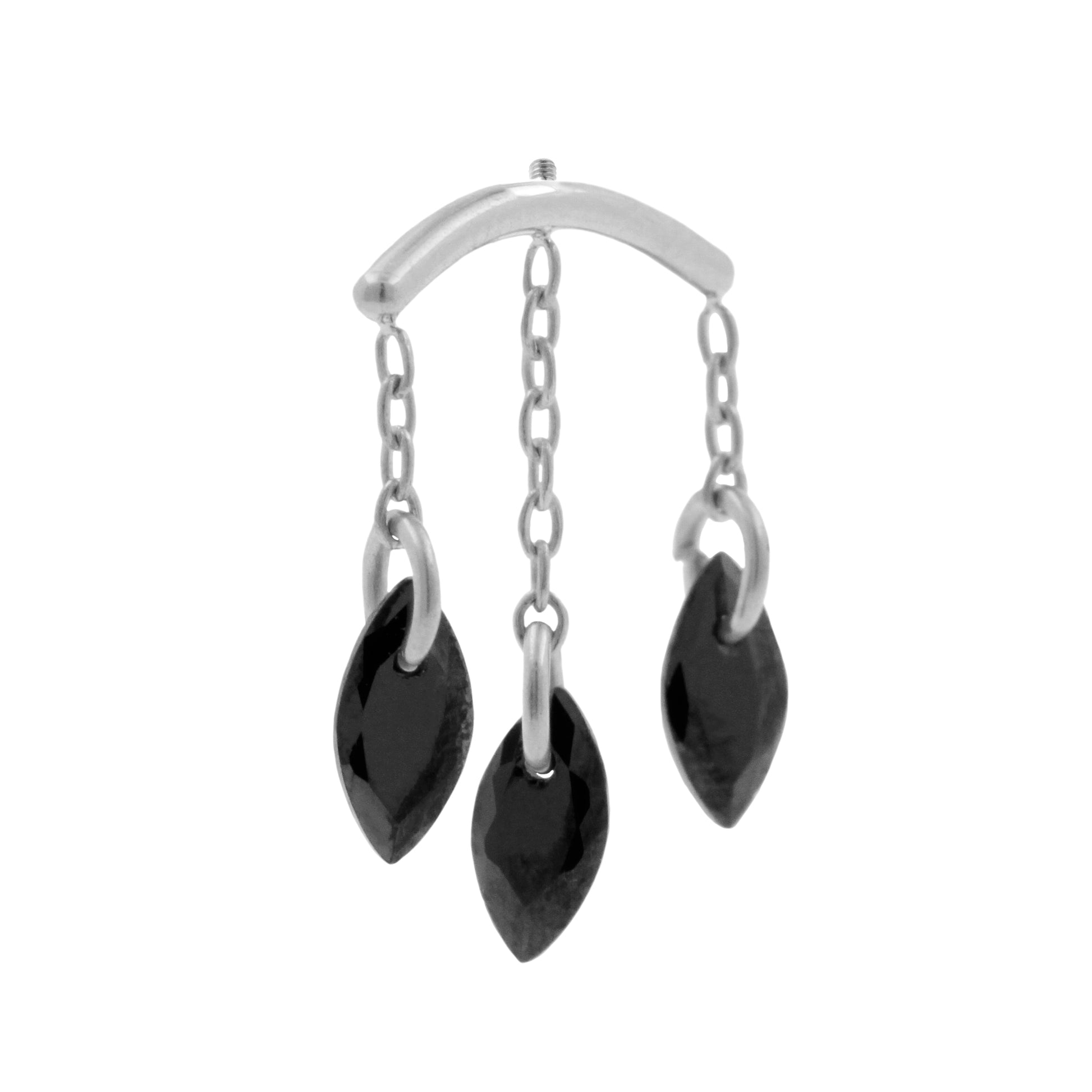 Give your vertical helix piercing an elegant look with this titanium curve, featuring dangling sparkling black cubic zirconia. The titanium is finished with silver-colored PVD CoCr coating with the look of white gold (nickel-free). This piece is internally threaded and compatible with 1.2 mm internally threaded bars, ensuring safe and comfortable wear.