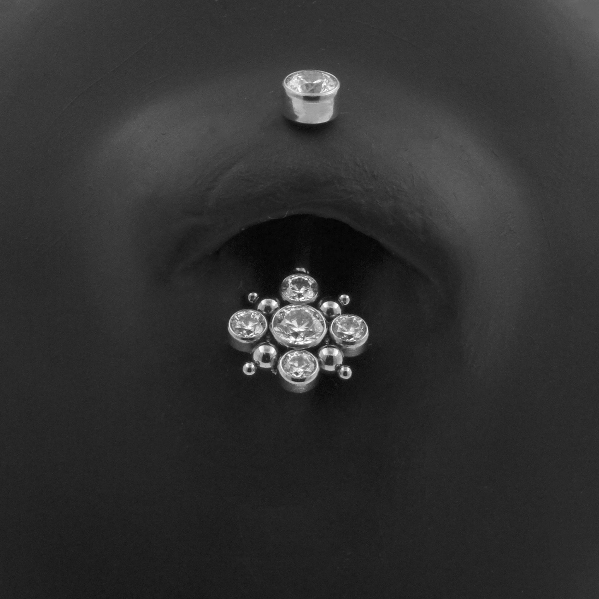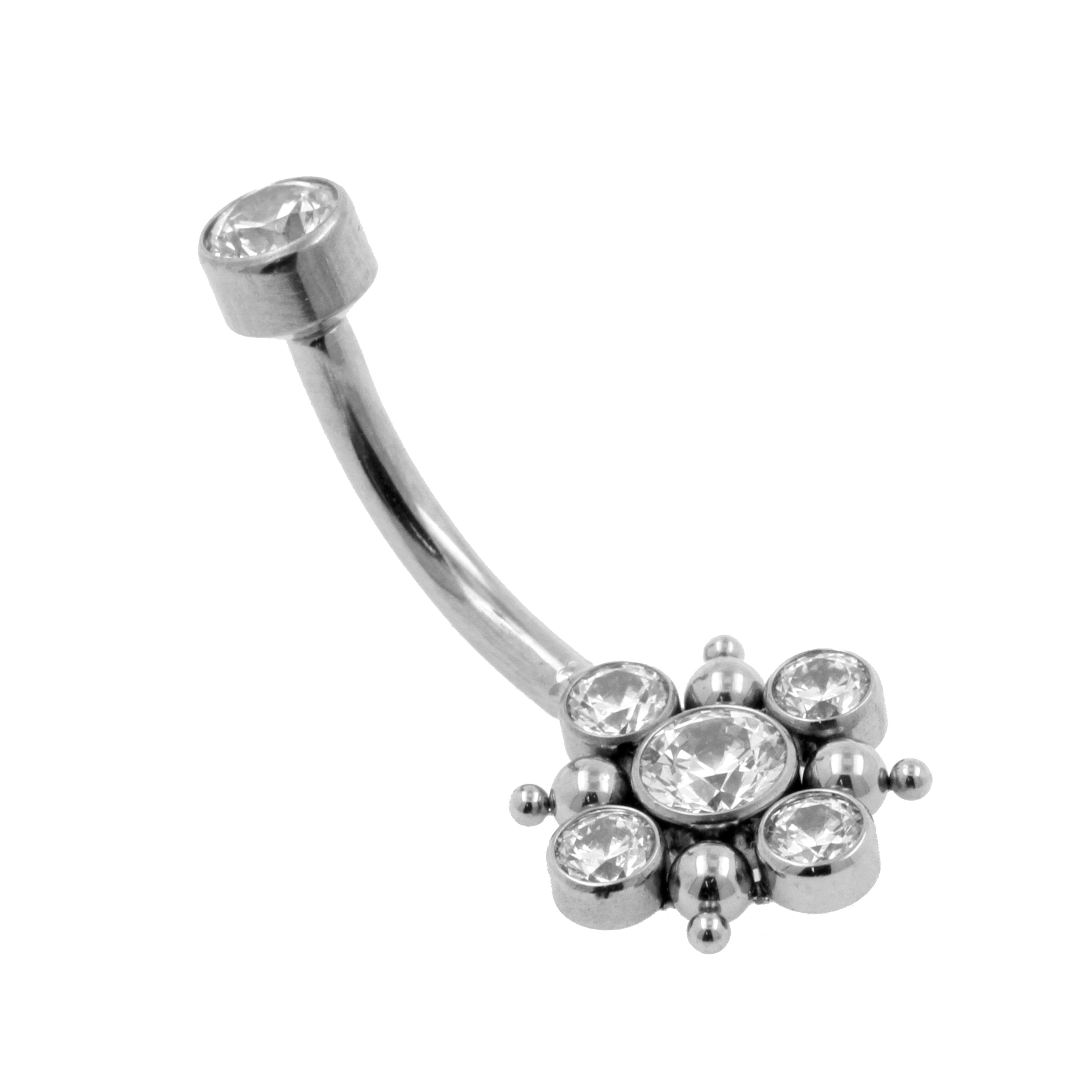 Stand out in the crowd with our Titanium Cluster piercing jewelry! This internally threaded belly ring measures 1,6 mm in thickness and is available in different lengths, perfect for pierced navels. The front of each belly ring is set with a beautiful cluster with genuine zirconia. Made of high quality titanium and fitted with internal thread, which makes changing your jewelry a lot more comfortable. Swap out your regular navel jewelry for these one of a kind pieces now, and turn your belly ring into a real eyecatcher! (Extra info: the thread of the accessory measures 1,2 mm in thickness and is compatible with other 1,6 mm internally threaded piercing jewelry from our shop.)