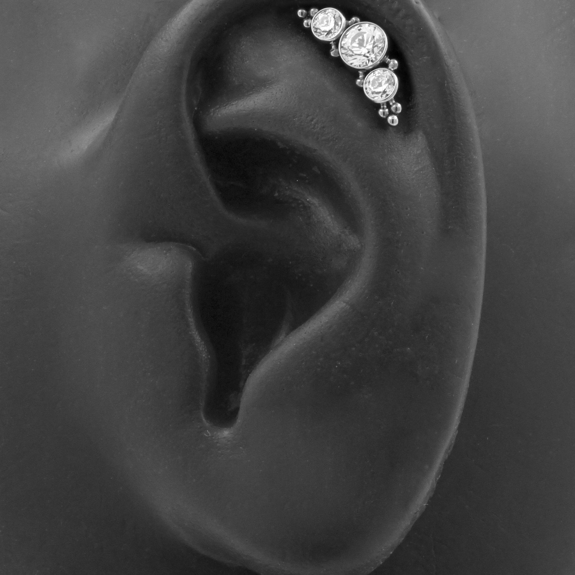 Stand out in the crowd with our Titanium Zirconia Cluster piercing jewelry! These clusters are perfect for all kinds of piercings. Each cluster is set with beautiful zirconias and made of high quality titanium. Suitable for 1,2 mm internally threaded piercing jewelry. (Extra info: the thread of the accessory itself measures 0,8 mm in thickness and is suitable for 1,2 mm All Over Piercings internally threaded piercing jewelry). You will receive the cluster accessory only upon ordering, without stud or post. Please note that due to the unique shape of the attachment, changing jewelry might be a bit more challenging. But practice makes perfect and it will all be more than worth it in the end, because our Zirconia Clusters will turn your piercings into real eyecatchers!