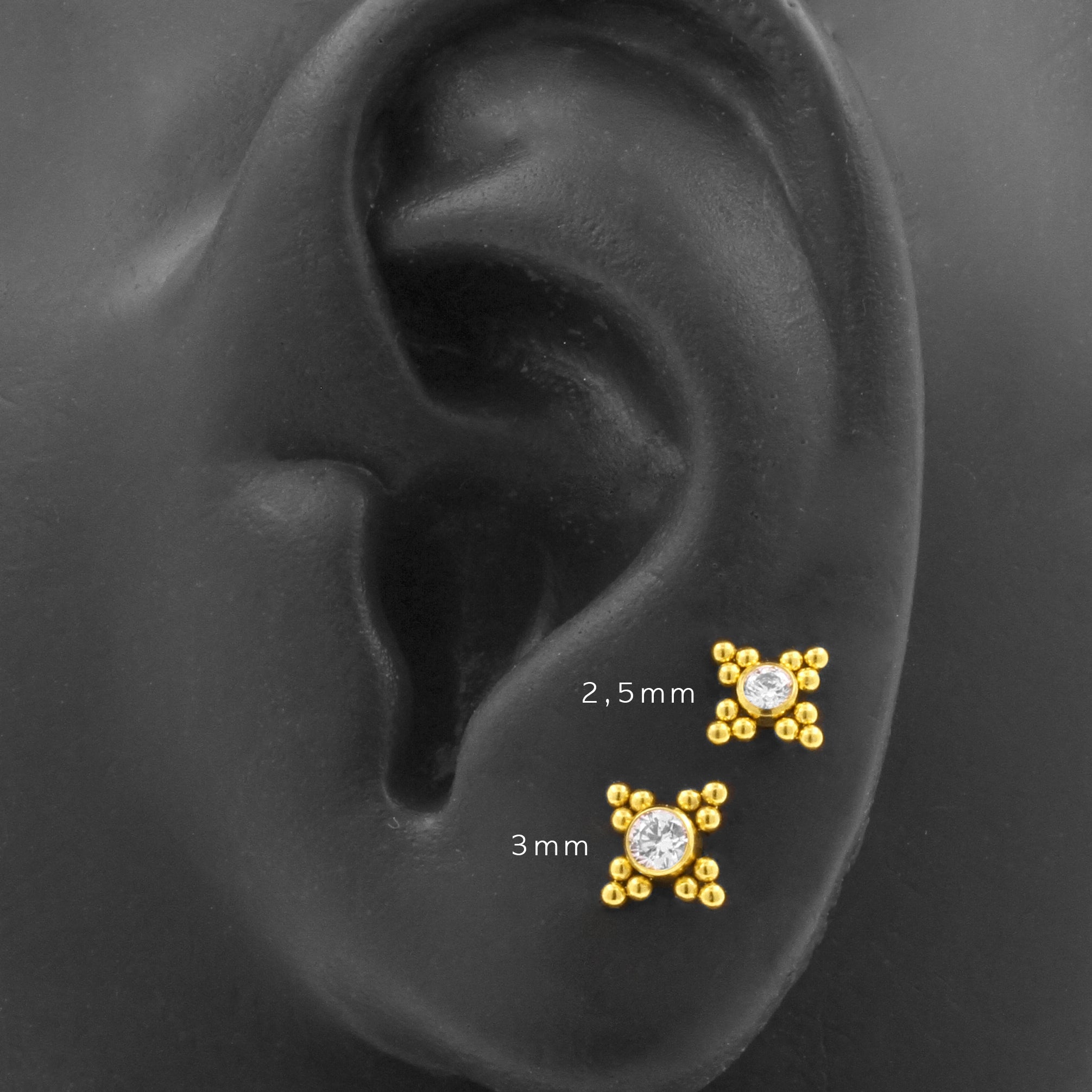 Stand out in the crowd with our Titanium Zirconia Cluster piercing jewelry! These clusters are perfect for all kinds of piercings. Each cluster is set with beautiful zirconias and made of titanium with 24 karat gold P.V.D. coating. Suitable for 1,2 mm internally threaded piercing jewelry. (Extra info: the thread of the accessory itself measures 0,8 mm in thickness and is suitable for 1,2 mm All Over Piercings internally threaded piercing jewelry). You will receive the cluster accessory only upon ordering, without stud or post. Please note that due to the unique shape of the attachment, changing jewelry might be a bit more challenging. But practice makes perfect and it will all be more than worth it in the end, because our Zirconia Clusters will turn your piercings into real eyecatchers!