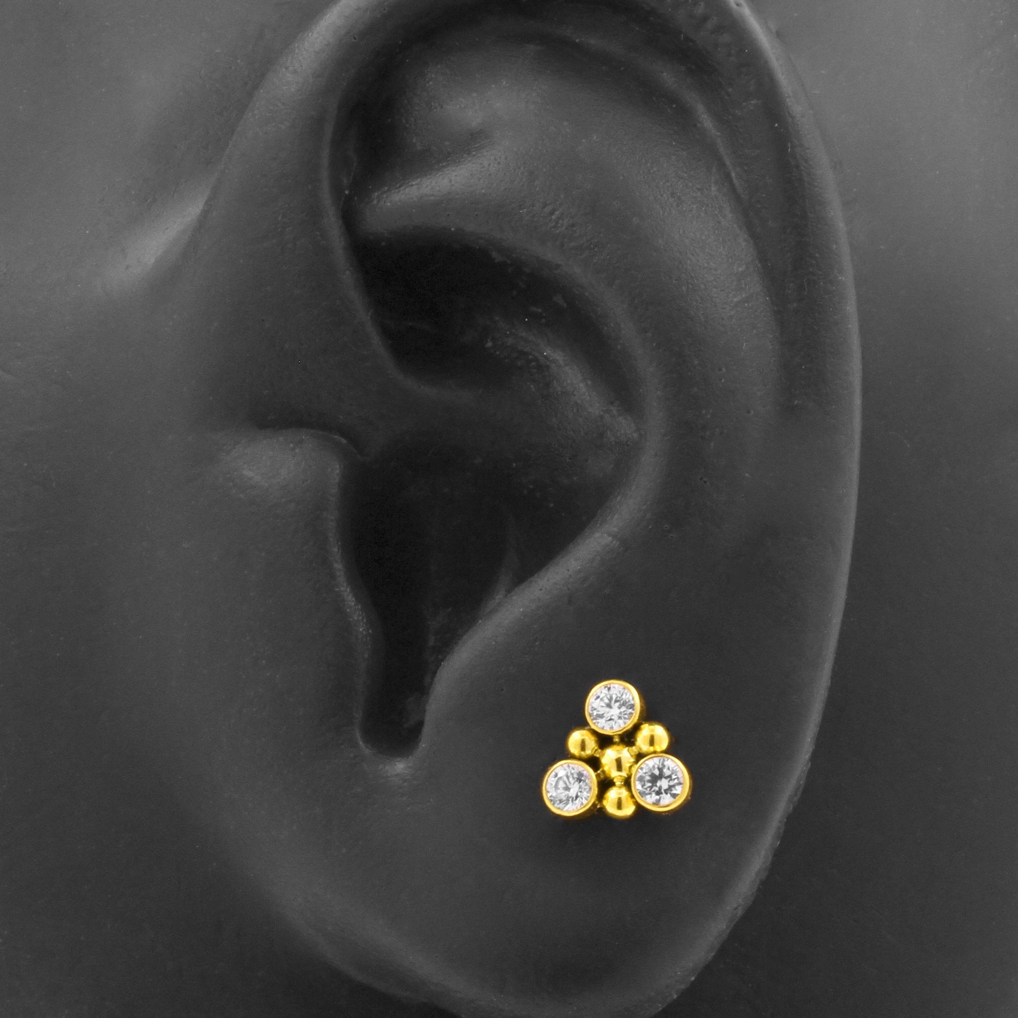 Stand out in the crowd with our Titanium Zirconia Cluster piercing jewelry! These clusters are perfect for all kinds of piercings. Each cluster is set with beautiful zirconias and made of titanium with 24 karat gold P.V.D. coating. Suitable for 1,2 mm internally threaded piercing jewelry. (Extra info: the thread of the accessory itself measures 0,8 mm in thickness and is suitable for 1,2 mm All Over Piercings internally threaded piercing jewelry). You will receive the cluster accessory only upon ordering, without stud or post. Please note that due to the unique shape of the attachment, changing jewelry might be a bit more challenging. But practice makes perfect and it will all be more than worth it in the end, because our Zirconia Clusters will turn your piercings into real eyecatchers!
