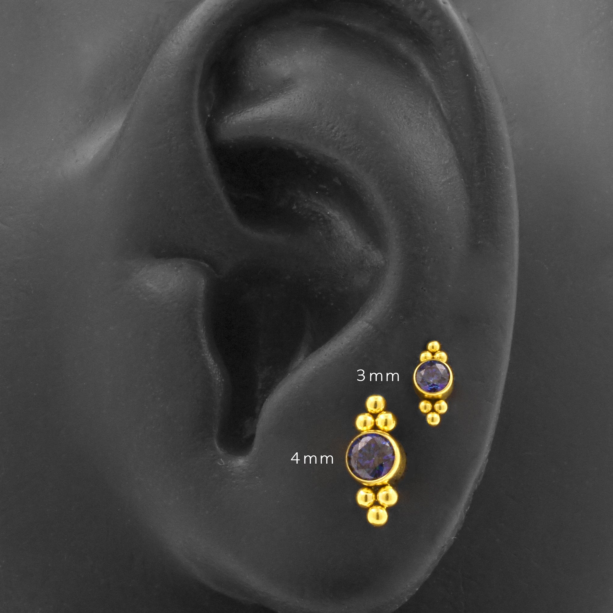 Stand out in the crowd with our Titanium Zirconia Cluster piercing jewelry! These clusters are perfect for all kinds of piercings. Each cluster is set with beautiful zirconias and made of titanium with 24 karat gold P.V.D. coating. Suitable for 1,2 mm internally threaded piercing jewelry. (Extra info: the thread of the accessory itself measures 0,8 mm in thickness and is suitable for 1,2 mm All Over Piercings internally threaded piercing jewelry). You will receive the cluster accessory only upon ordering, without stud or post. Please note that due to the unique shape of the attachment, changing jewelry might be a bit more challenging. But practice makes perfect and it will all be more than worth it in the end, because our Zirconia Clusters will turn your piercings into real eyecatchers!