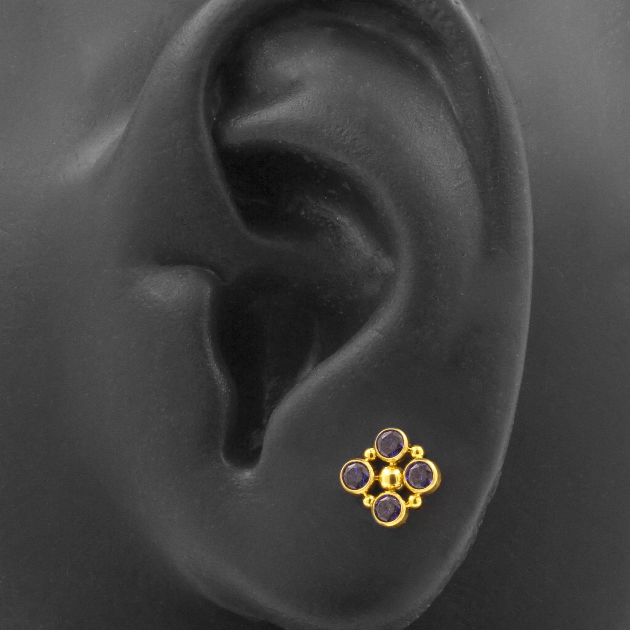 Stand out in the crowd with our Titanium Zirconia Cluster piercing jewelry! These clusters are perfect for all kinds of piercings. Each cluster is set with beautiful zirconias and made of titanium with 24 karat gold P.V.D. coating. Suitable for 1,2 mm internally threaded piercing jewelry. (Extra info: the thread of the accessory itself measures 0,8 mm in thickness and is suitable for 1,2 mm All Over Piercings internally threaded piercing jewelry). You will receive the cluster accessory only upon ordering, without stud or post. Please note that due to the unique shape of the attachment, changing jewelry might be a bit more challenging. But practice makes perfect and it will all be more than worth it in the end, because our Zirconia Clusters will turn your piercings into real eyecatchers!