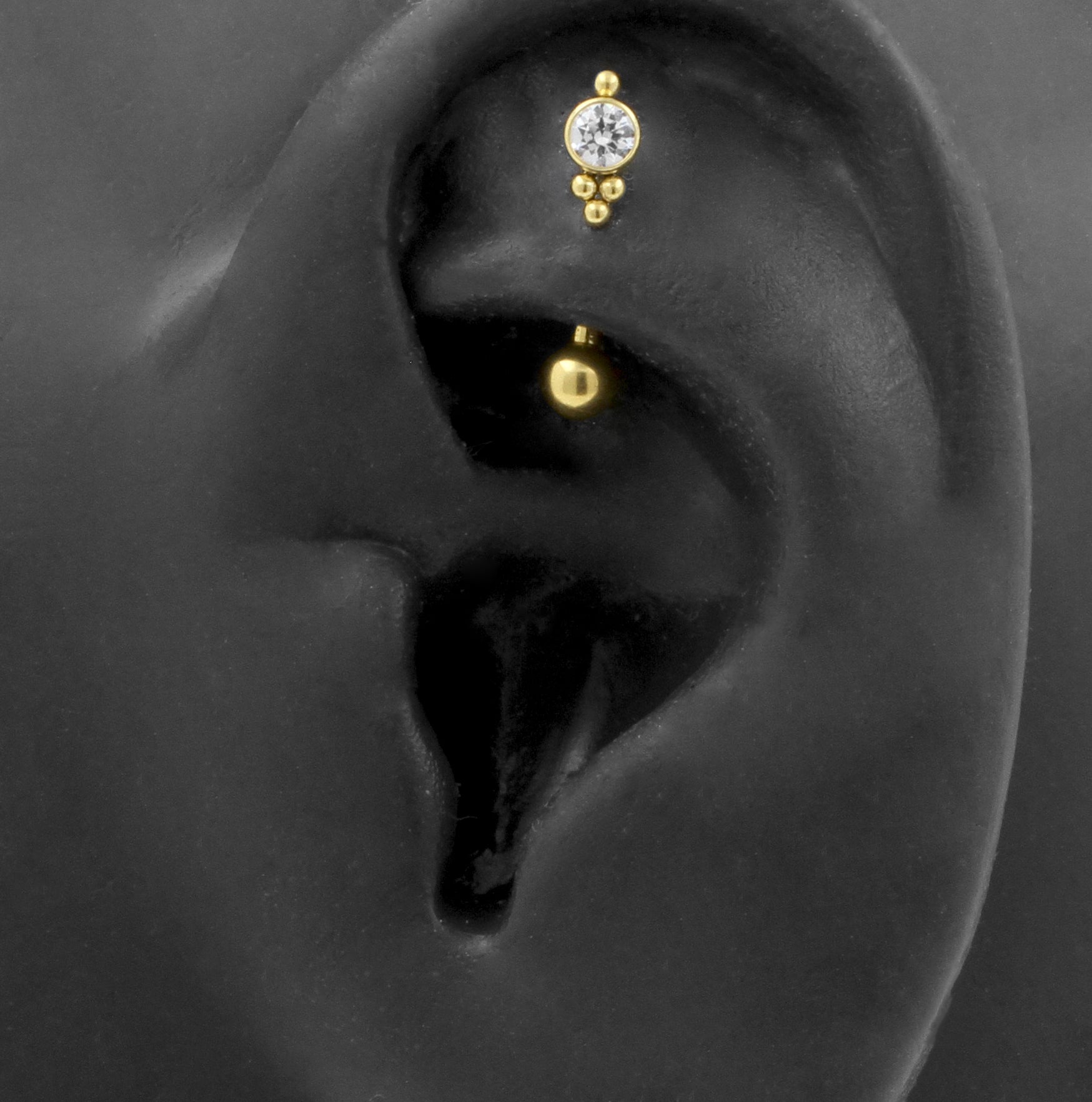 Stand out in the crowd with our Titanium Cluster piercing jewelry! This Titanium Cluster Rook Piercing is perfect for rook piercings and eyebrow piercings. Each cluster is set with genuine zirconia. Made of high quality titanium and suitable for 1,2 mm internally threaded piercing jewelry. Please note that due to the unique shape of the attachment, changing jewelry might be a bit more challenging. But practice makes perfect and it will all be more than worth it in the end, because our Cluster Jewelry will turn your piercings into real eyecatchers! (Extra info: the thread of the accessory measures 0,8 mm in thickness and is compatible with other 1,2 mm internally threaded piercing jewelry from our shop.)