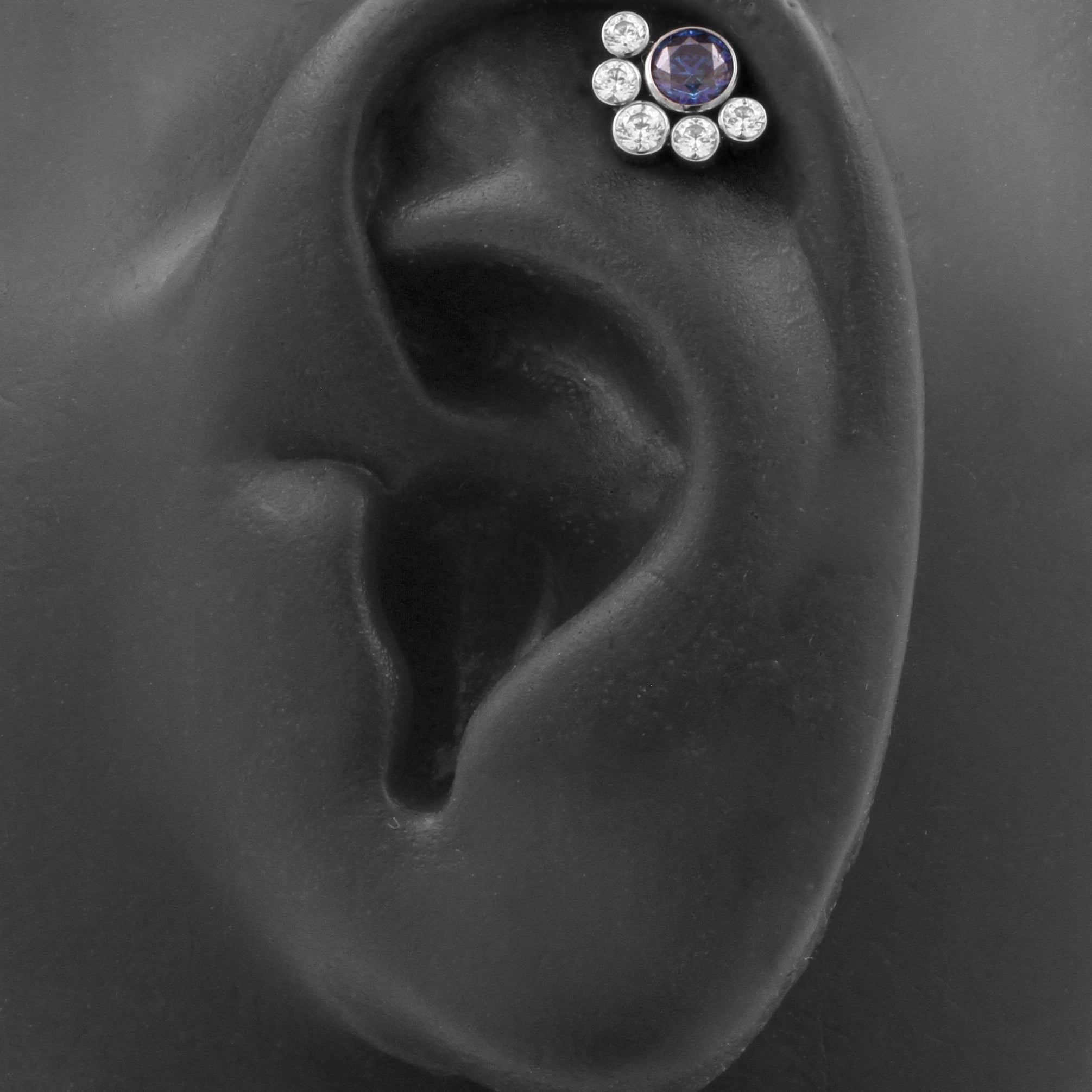Stand out in the crowd with our Titanium Zirconia Cluster piercing jewelry! These clusters are perfect for all kinds of piercings. Each cluster is set with beautiful zirconias and made of high quality titanium. Suitable for 1,2 mm internally threaded piercing jewelry. (Extra info: the thread of the accessory itself measures 0,8 mm in thickness and is suitable for 1,2 mm All Over Piercings internally threaded piercing jewelry). You will receive the cluster accessory only upon ordering, without stud or post. Please note that due to the unique shape of the attachment, changing jewelry might be a bit more challenging. But practice makes perfect and it will all be more than worth it in the end, because our Zirconia Clusters will turn your piercings into real eyecatchers!